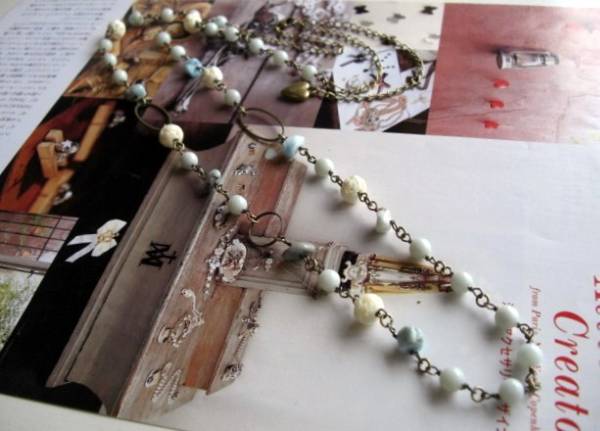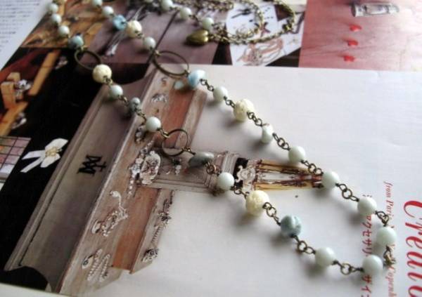 6月の花嫁・・シリーズです♪水色をアートして・・爽やかなラリマーとアマゾナイトのネックレスです♪シックな水色のラリマーや水色にブラウンやブラックのお色が合わさったナチュラル感あふれるアマゾナイトに透かしのボーンを合わせて可憐な表情です♪8ミリ位のラリマーに6ミリの丸玉のアマゾナイトや9ミリの透かしボーンやデザインリングを合わせました♪長さは全長102センチ位で調節自由です♪2連にされても素敵です♪お揃いのネックレスやブレスレットも出品しています♪シンプルで合わせやすいデザインを考えました♪ハンドメイドをご理解いただいてノークレーム、ノーリターンでお願いします♪
