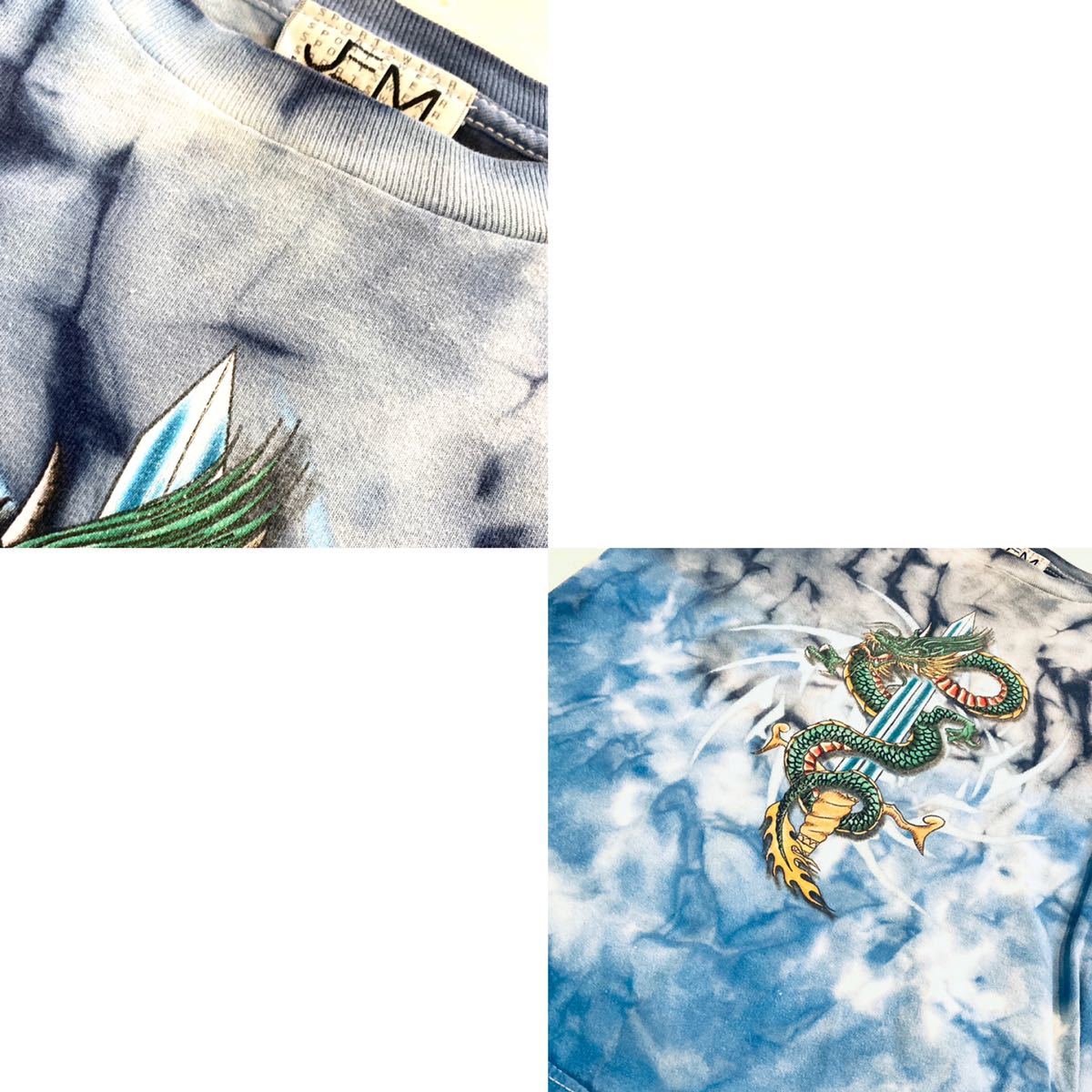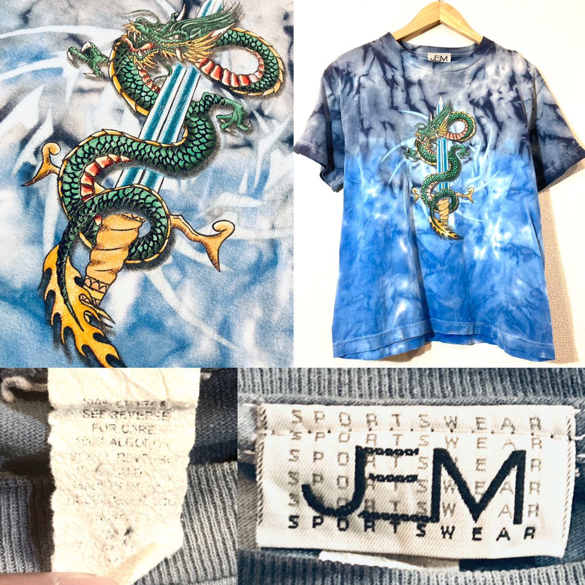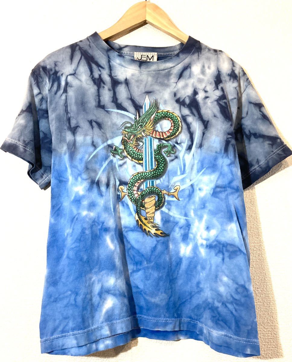 ネイビーとブルーの絞り染めが施されたTシャツで、ドラゴンのプリントの入ったインパクトのあるデザインになっています★