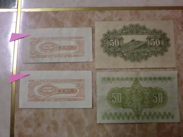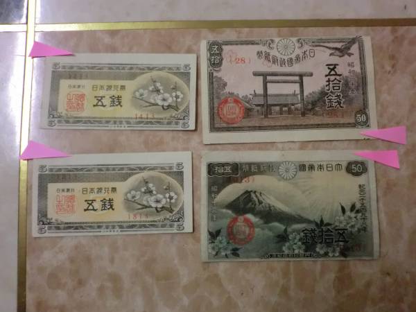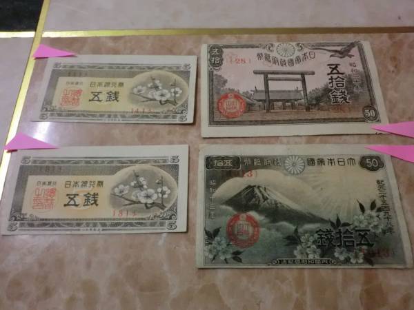 富士桜50銭・靖国50銭・梅5銭 2枚の4枚セットで裁断のズレです。
