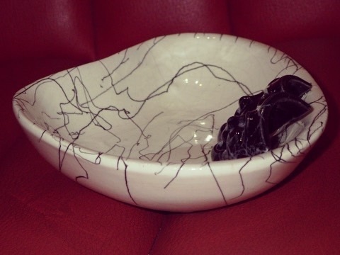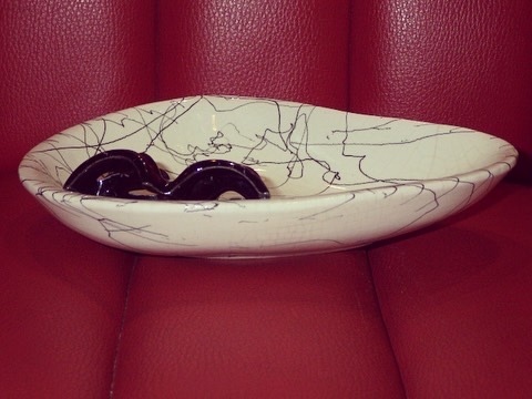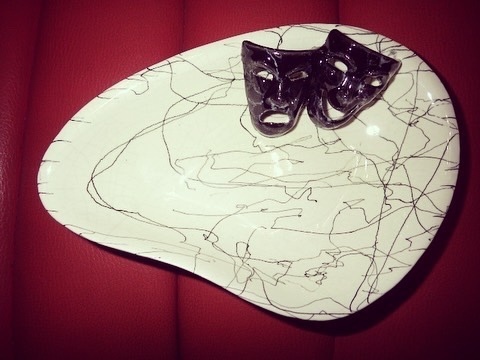 アトミックなブーメランシェイプ、スパゲティペイント、泣き笑いデコレーションタイプ、最近はなかなか見つかりにくい、MARCIA OF CALIFORNIA(カリフォルニア陶器製)、USA製の当時もの♪
