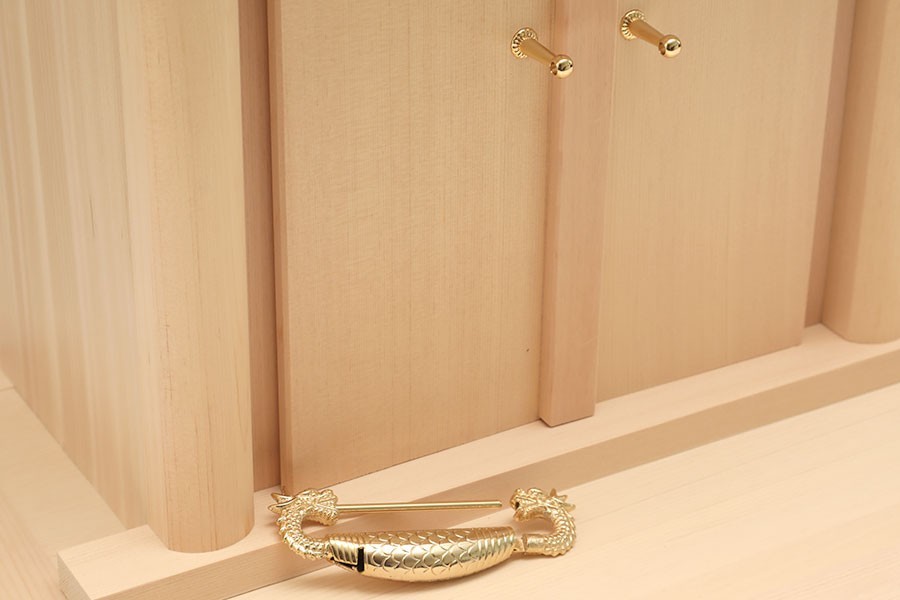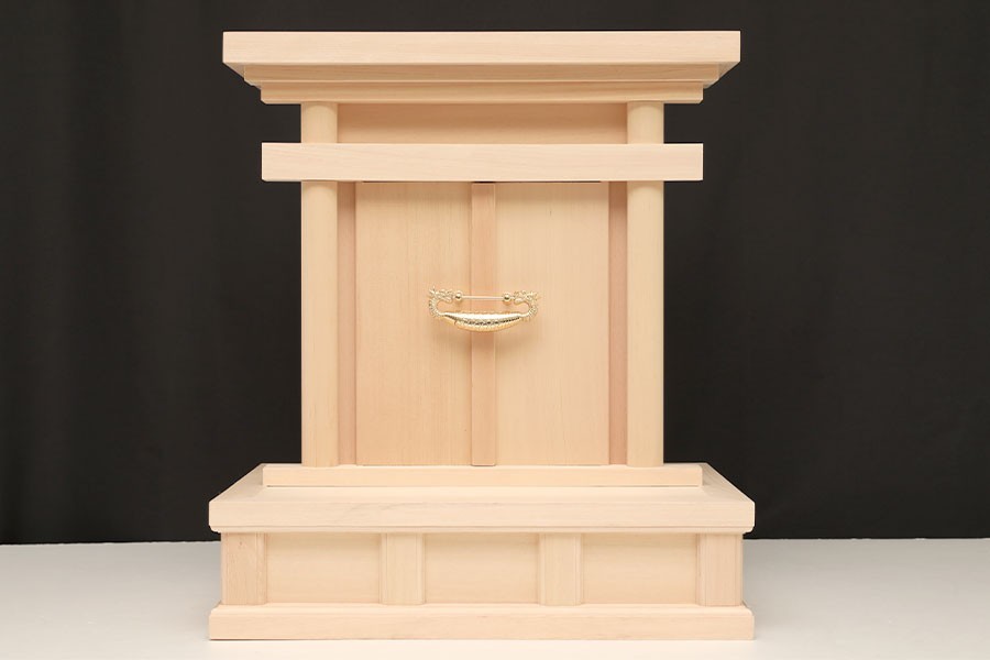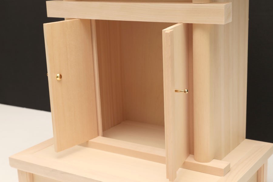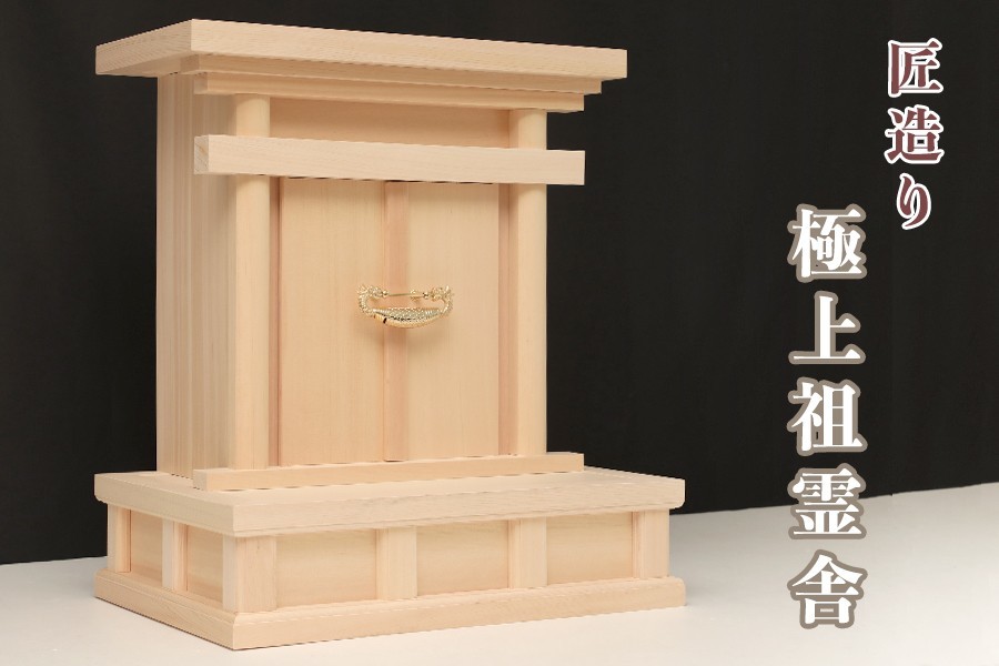 お支払方法に代引きはお選びいただけません。 美しい木曽ひのき無垢材で作成された贅沢で高貴な逸品。神徒檀の代わりとしてとして省スペース、コンパクトにお祀りいたします。 モダン神棚調のすっきりとしたシンプルなデザインです。材質は最高級の木曽桧、密な年輪と整った柾目。 扉の錠は真鍮製の「海老錠」がしつらえてあり、厳かな雰囲気の祖霊舎です。奥行サイズにゆとりを持たせた設計ですので、ゆったりと「御霊代」をご安置できます。 心を込めてお祀りされたい方に。 | ||||