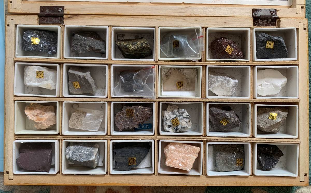各標本の鑑賞価値はそれほど高くありませんが、教科書的に24種の鉱石・鉱物・岩石・化石が揃っており、なかなか手に入りにくいものと思います。