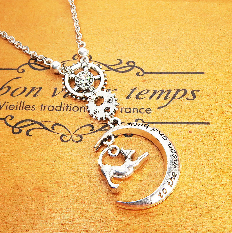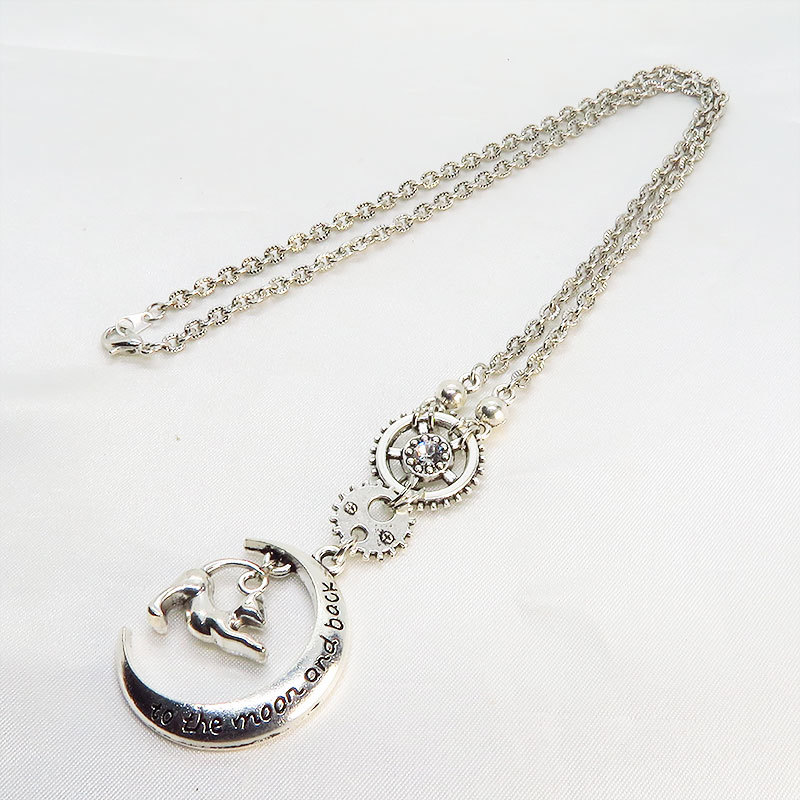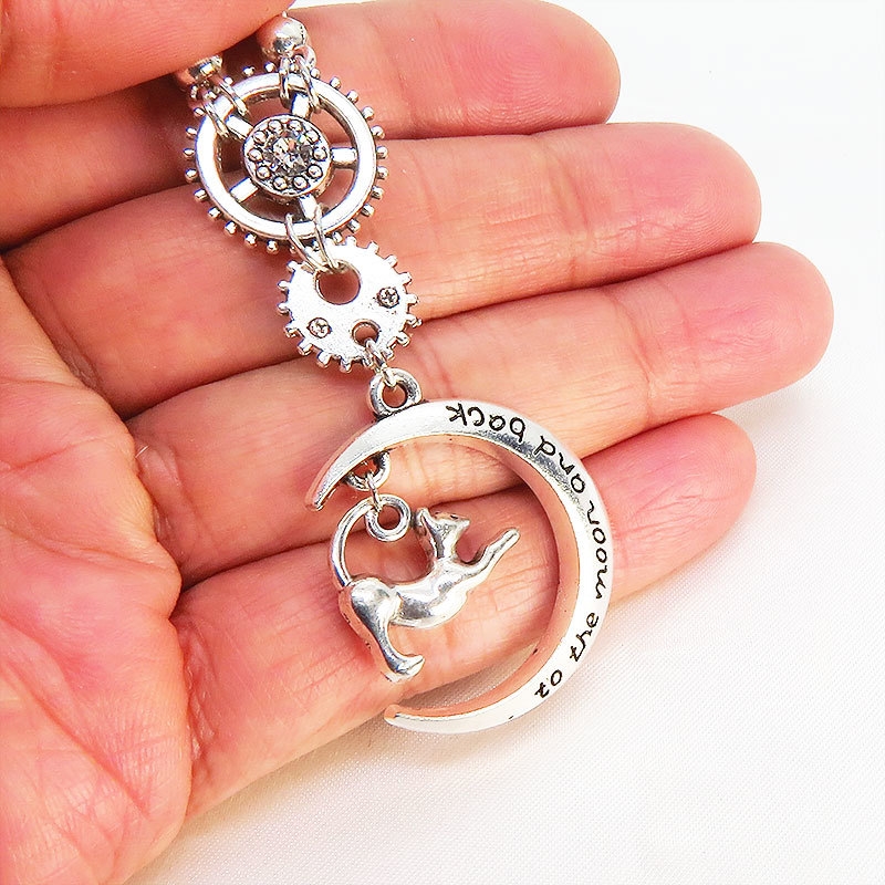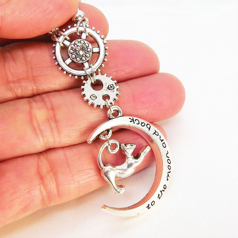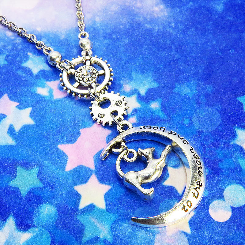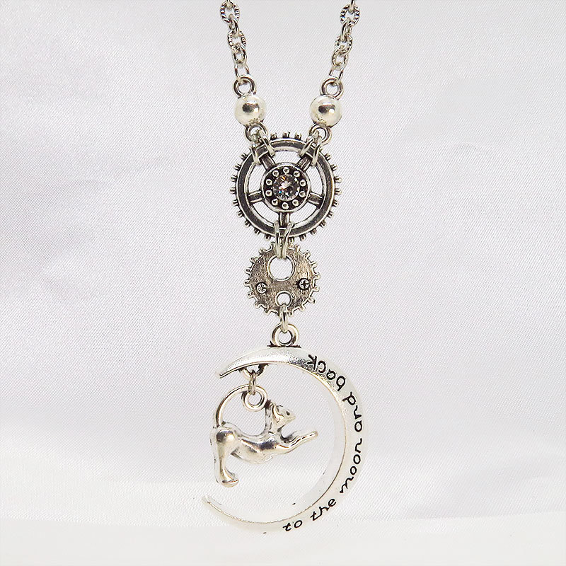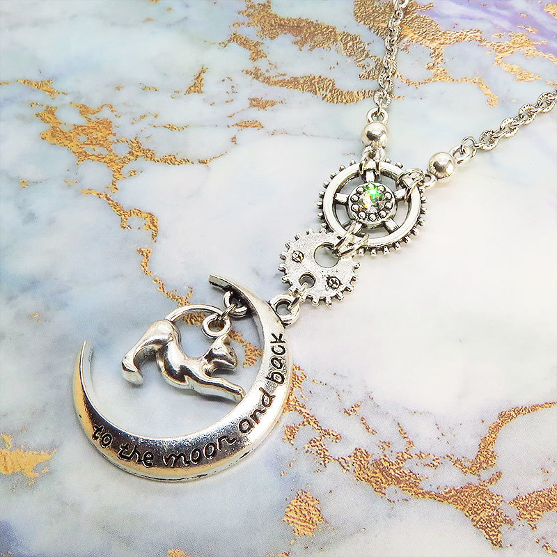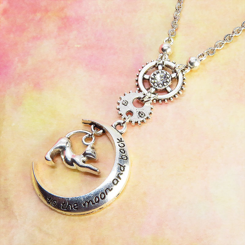 アンティークシルバー 伸び猫と三日月と歯車のスチームパンク風ネックレス スワロフスキー 長さ調整可