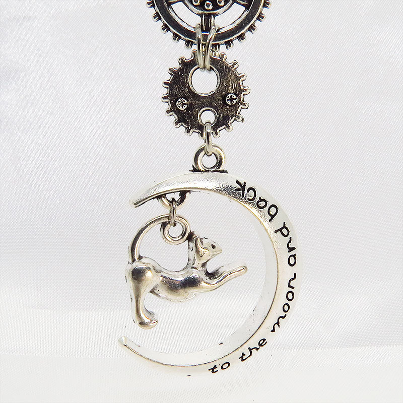 大小異なる形状の歯車を使いスチームパンクの風合いを演出し、三日月には伸びをした猫をつり下げ、どこか懐かしさを感じさせるデザインはあなたの心を惹きつけます
