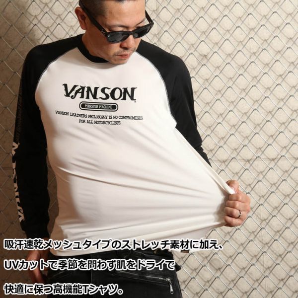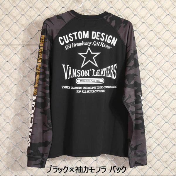VANSON ドライ長袖Tシャツ ACVL-903 ブラック×袖カモフラ【XLサイズ】バンソン 当店別注 吸汗速乾 抗菌防臭 UVカット スポーツウェア