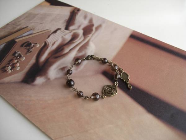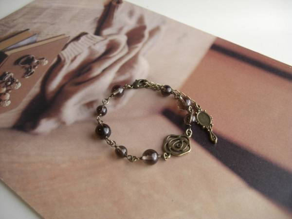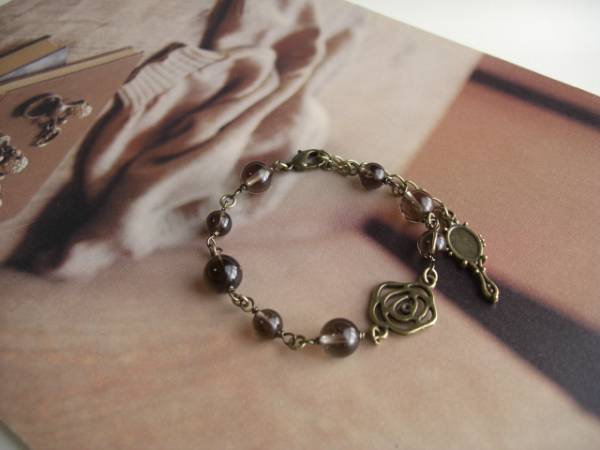 ネオ・ロマンチック・・シリーズです♪モノトーンの薔薇・・繊細なスモーキークォーツのブレスレットです♪薔薇のチャームを合わせてアンティークな表情です♪6ミリ、8ミリの丸玉のスモーキークォーツに薔薇のチャームを合わせました♪長さは全長23センチ位で調節自由です♪お揃いのブレスレットやネックレスも出品しています♪シンプルで飽きのこないいつまでも着けられるデザインを考えて作りました!ハンドメイドをご理解頂いてノークレーム、ノーリターンでお願いします