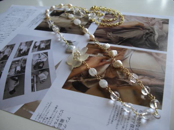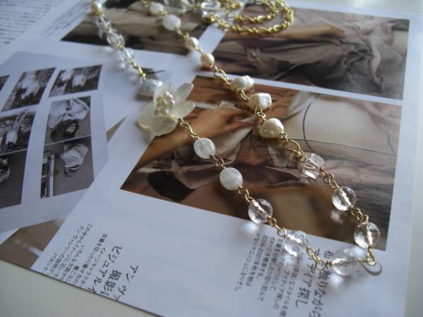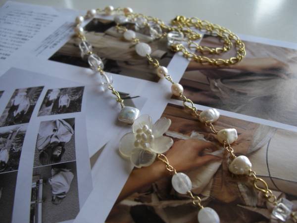 クレアの衣装箱・・シリーズです♪やさしい白を集めて・・ふんわりやさしいオフ・ホワイトの淡水パールのネックレスです♪水晶やムーンストーン、ナチュラル・アゲートのお花を合わせて可憐な表情です♪8ミリから10ミリ位までのライスやポテト、スクエアや芥子などデザイン違いの淡水パールにオーバルのムーンストーン、8ミリのランダムカットやラフ・タンブルの水晶、30ミリ位のナチュラル・アゲートのお花を合わせました♪長さは全長99センチ位で調節自由です♪2連にされても素敵です♪お揃いのブレスレットやピアスも出品しています♪シンプルで長く着けていただけるデザインを考えて作りました!ハンドメイドをご理解頂いてノークレーム、ノーリターンでお願いします