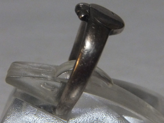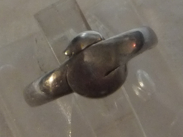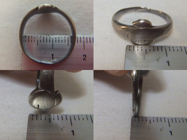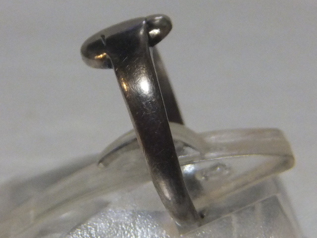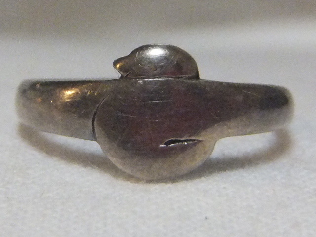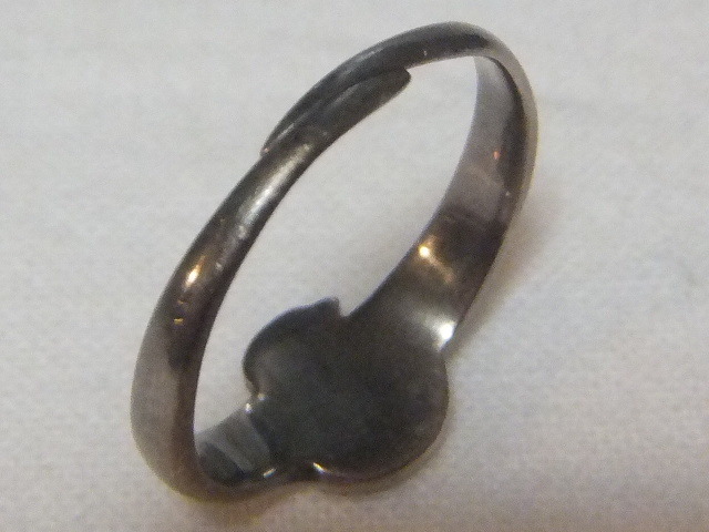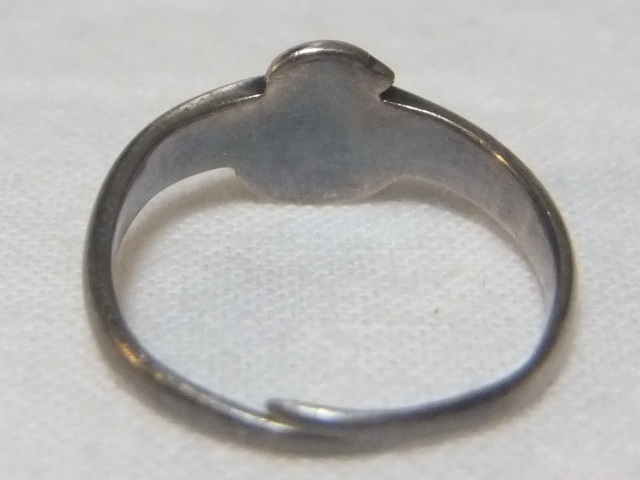 昭和期頃の家紋モチーフの指輪で購入先(アンティーク着物小物取扱い店)からは家紋は千鳥、雁、雀、じゃないかとの事でした。金属は硬質で刻印はございません(磁石反応無し)。少々の金属汚れや小傷がみられますが装着に問題はございません。男女兼用デザインですのでおすすめです。現在8号ですがフリーサイズタイプですので多少の調節は可能で女性でしたら合う指に、男性でしたらピンキーサイズ位です。お探しの方いかがでしょうか。
