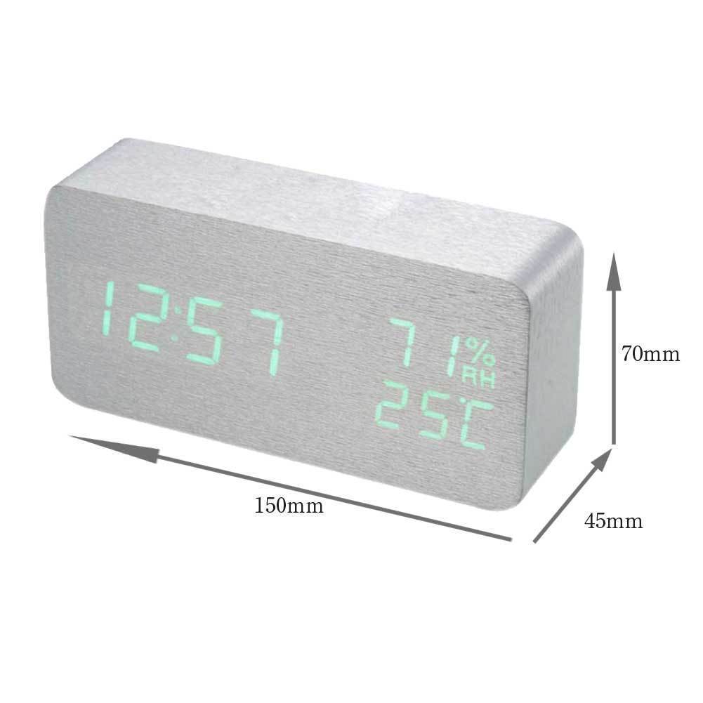 【多機能】:(1)12H制/24H制 (2)温度 (3)湿度 (4)アラーム3組 (5)音声感知/常時点灯 (6)明るさ3段階調節 (7)電源切れた時も設定記憶 (8)省エネモード