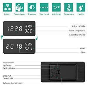 音声コントロールをONにして、約12秒経過すると、LEDが消灯しておきます。60db以上の音(騒音程度)や振動(手で叩き)を感知した時だけ点灯する設定も可能なので、休み中がLEDの光りが気になる方にはお勧めのベッドサイド時計です。