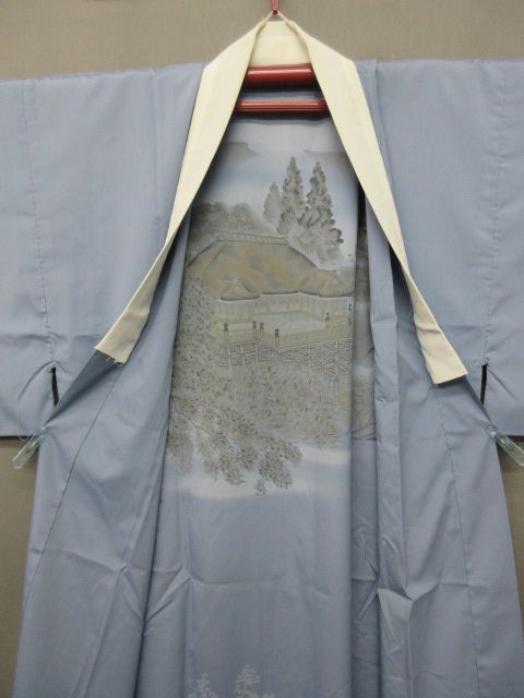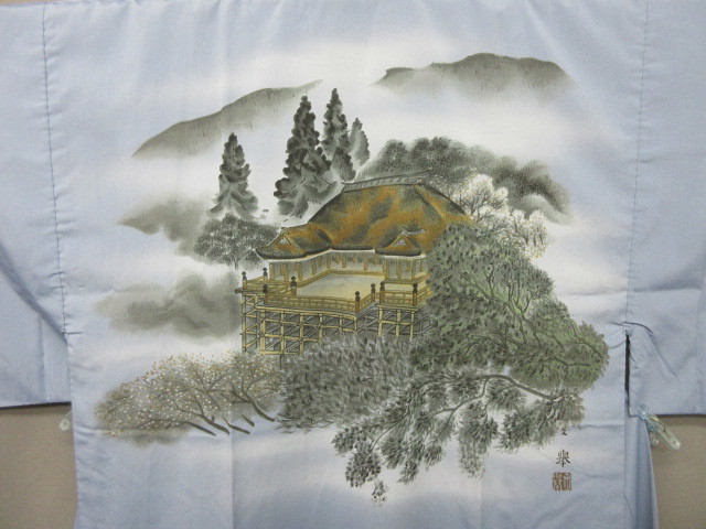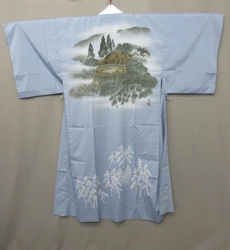【政】30082 男物長襦袢 清水寺に松林 銘有り 化繊 着物