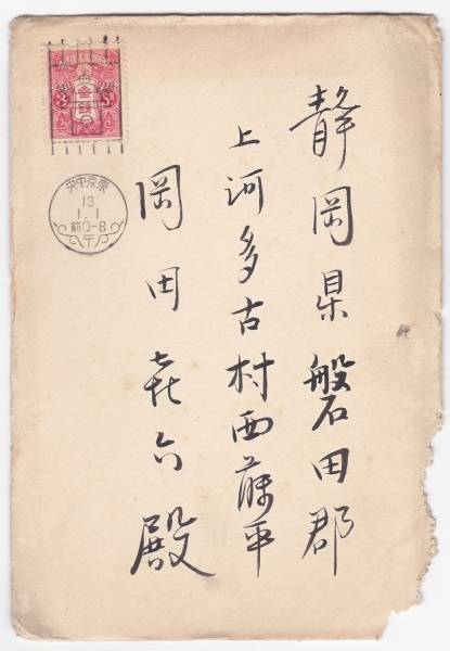 田沢昭和白紙3銭貼書状 年賀用機械印(鏡餅) 東京中央/13.1.1/前0-8