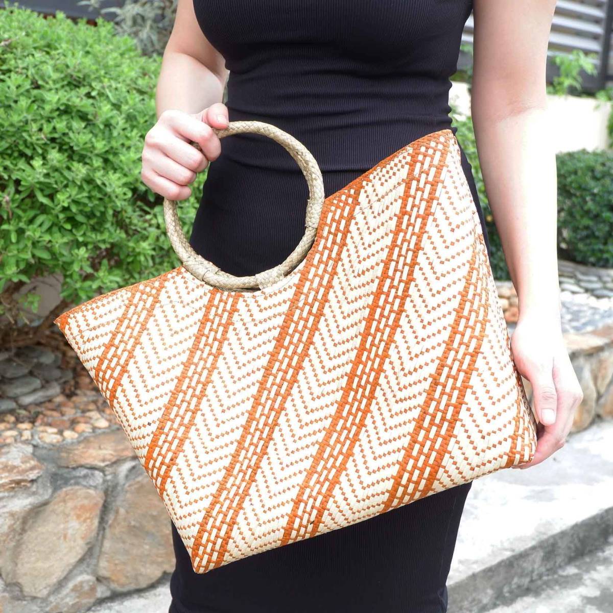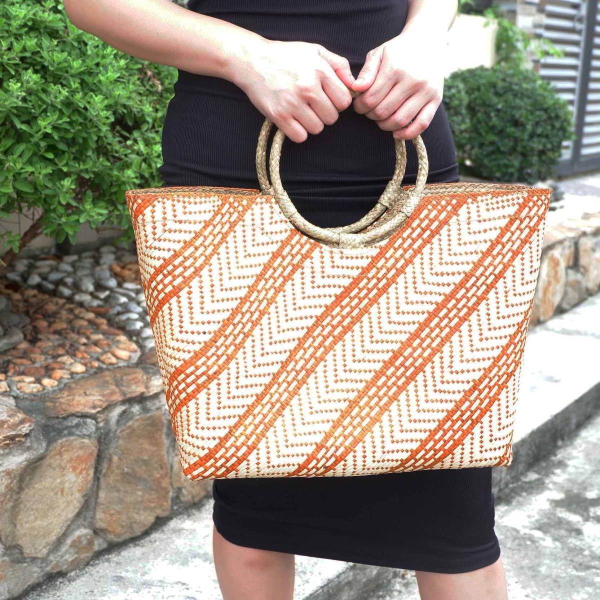 バニグはフィリピンで昔から作られている伝統的な手織り物で、ヤシ系植物の葉(ブリ、パンダナス、ティコグなど)から手作業で作られ、主にマットとして使われていました。この技術が発展し、マットだけではなく、帽子や靴、バッグなどに用いられる様になりました。 ここ数年、ヨーロッパやアメリカで大変話題となり、多くのセレブにも人気が高まっています。この需要の高まりと共にフィリピンの大事な産業になり、仕事のなかった地域の人の収入源にもなっています。 素材となる葉の加工は全て手作業で行われ、乾燥は天日干しの為、天候に左右されます。その後、用途に応じて、様々な色で染色が施されます。通常バニグを1枚作るのに職人さん1人が1週間かかり、さらにバッグに加工するのに別の専門の職人さんが1~2週間かけて作ります。 サイズ 全高:約36cm 高さ:約27cm 上幅:約45cm 下幅:約33cm マチ:約12cm 取っ手内径:約13cm ハンドメイド商品について:当商品はハンドメイドの為、商品によっては多少の型崩れがある場合が御座いますが、これはハンドメイドの魅力でもあります。アジアン雑貨特有の小さなキズやヒビ・色むら等は、ご理解頂ければと思います。 写真のモデルさんの身長は約160cmです。 撮影はフィリピンで行いました。 | |||