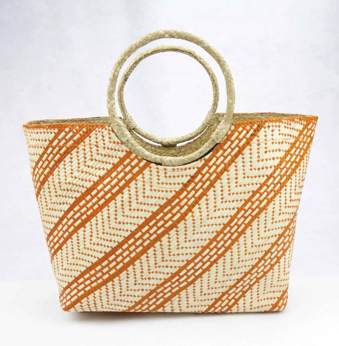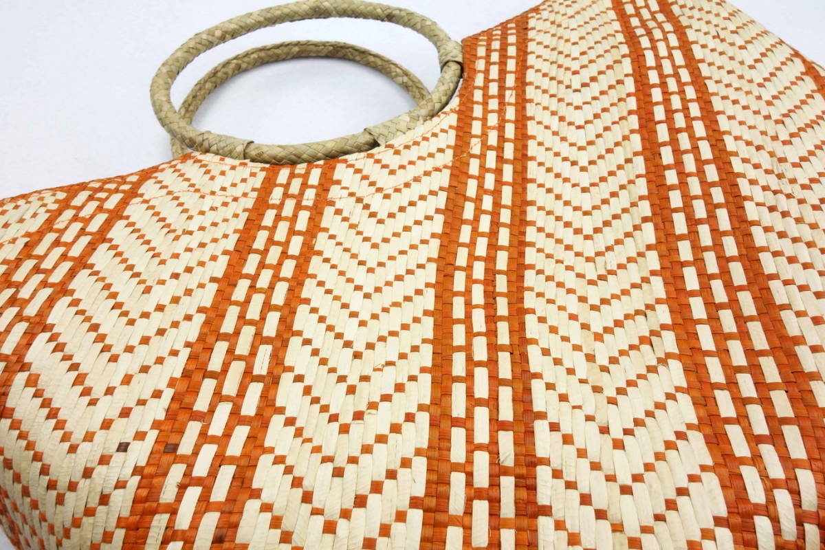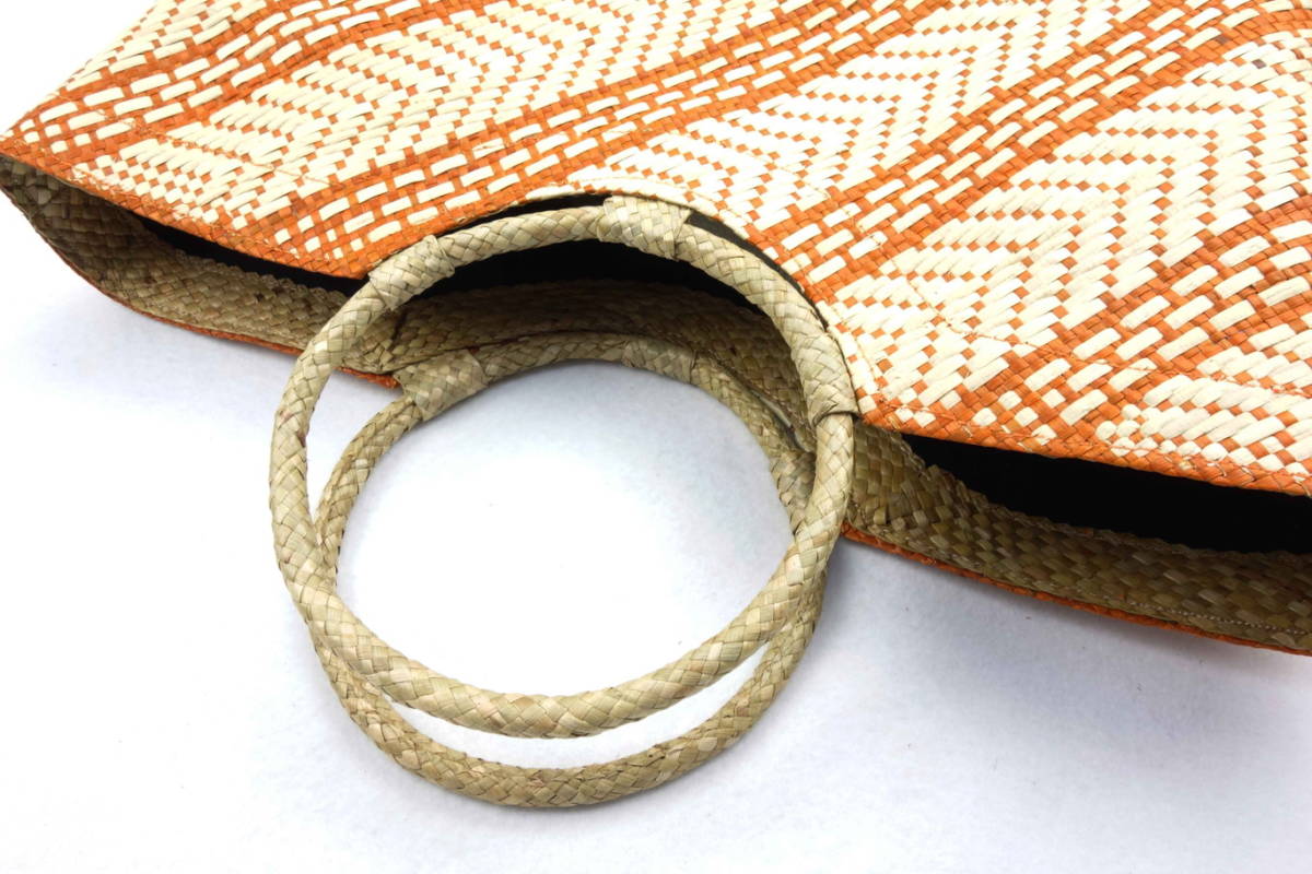 バニグはフィリピンで昔から作られている伝統的な手織り物で、ヤシ系植物の葉(ブリ、パンダナス、ティコグなど)から手作業で作られ、主にマットとして使われていました。この技術が発展し、マットだけではなく、帽子や靴、バッグなどに用いられる様になりました。 ここ数年、ヨーロッパやアメリカで大変話題となり、多くのセレブにも人気が高まっています。この需要の高まりと共にフィリピンの大事な産業になり、仕事のなかった地域の人の収入源にもなっています。 素材となる葉の加工は全て手作業で行われ、乾燥は天日干しの為、天候に左右されます。その後、用途に応じて、様々な色で染色が施されます。通常バニグを1枚作るのに職人さん1人が1週間かかり、さらにバッグに加工するのに別の専門の職人さんが1~2週間かけて作ります。 サイズ 全高:約36cm 高さ:約27cm 上幅:約45cm 下幅:約33cm マチ:約12cm 取っ手内径:約13cm ハンドメイド商品について:当商品はハンドメイドの為、商品によっては多少の型崩れがある場合が御座いますが、これはハンドメイドの魅力でもあります。アジアン雑貨特有の小さなキズやヒビ・色むら等は、ご理解頂ければと思います。 写真のモデルさんの身長は約160cmです。 撮影はフィリピンで行いました。 | |||