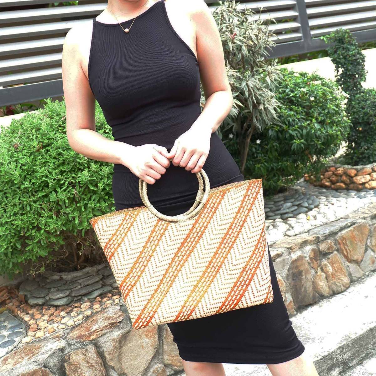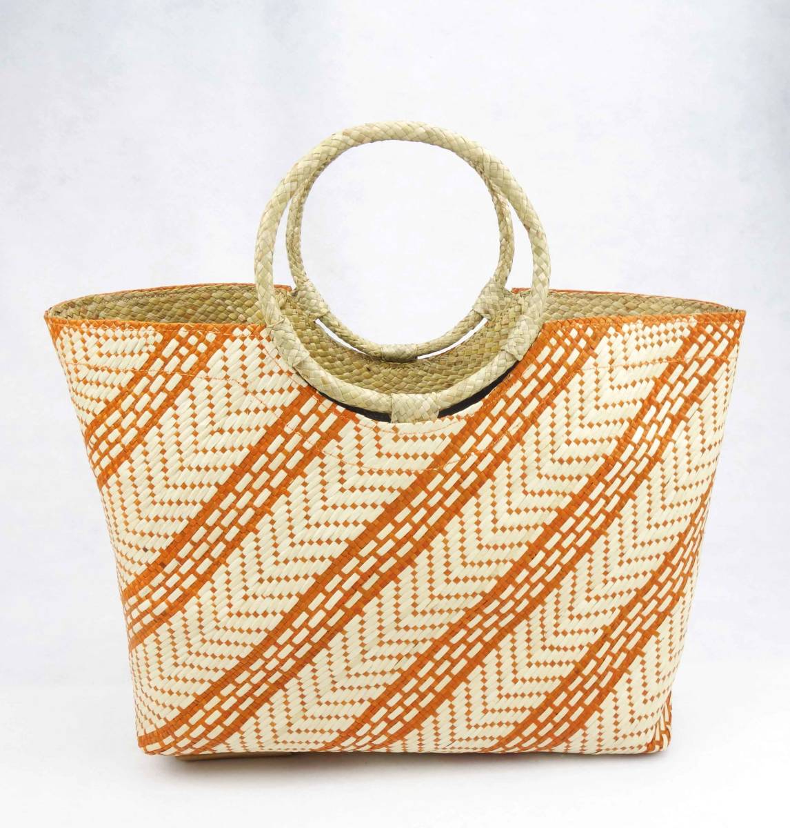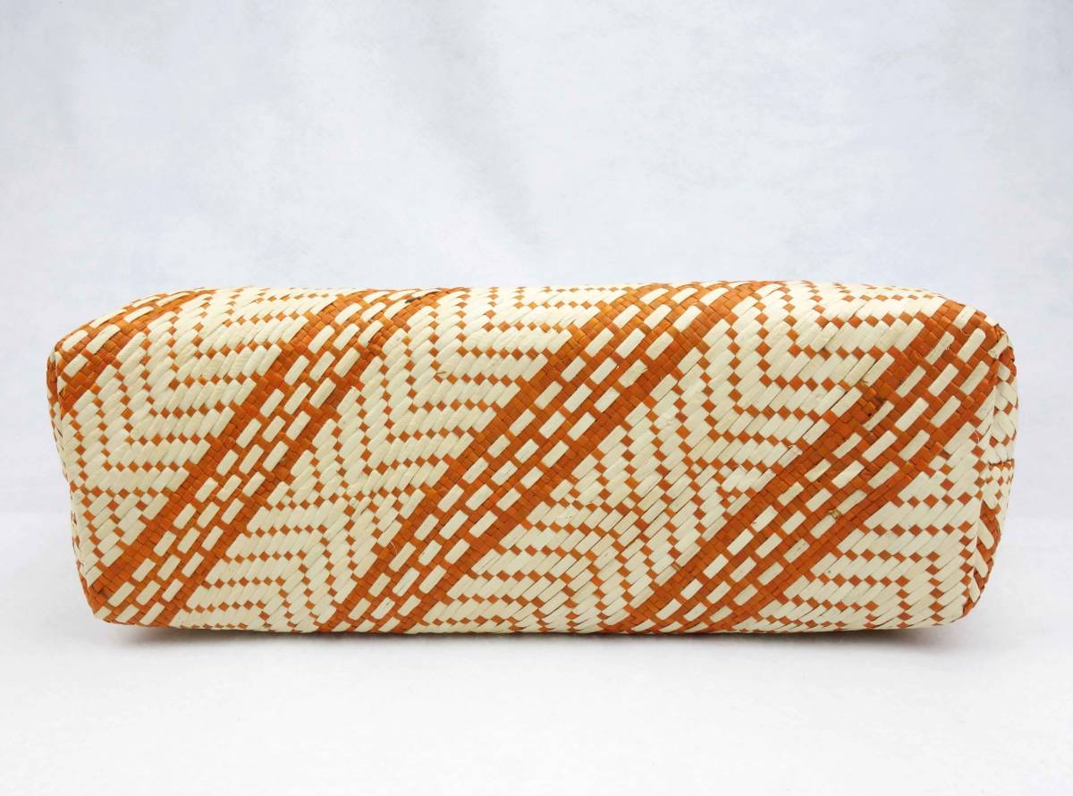 バニグはフィリピンで昔から作られている伝統的な手織り物で、ヤシ系植物の葉(ブリ、パンダナス、ティコグなど)から手作業で作られ、主にマットとして使われていました。この技術が発展し、マットだけではなく、帽子や靴、バッグなどに用いられる様になりました。 ここ数年、ヨーロッパやアメリカで大変話題となり、多くのセレブにも人気が高まっています。この需要の高まりと共にフィリピンの大事な産業になり、仕事のなかった地域の人の収入源にもなっています。 素材となる葉の加工は全て手作業で行われ、乾燥は天日干しの為、天候に左右されます。その後、用途に応じて、様々な色で染色が施されます。通常バニグを1枚作るのに職人さん1人が1週間かかり、さらにバッグに加工するのに別の専門の職人さんが1~2週間かけて作ります。 サイズ 全高:約36cm 高さ:約27cm 上幅:約45cm 下幅:約33cm マチ:約12cm 取っ手内径:約13cm ハンドメイド商品について:当商品はハンドメイドの為、商品によっては多少の型崩れがある場合が御座いますが、これはハンドメイドの魅力でもあります。アジアン雑貨特有の小さなキズやヒビ・色むら等は、ご理解頂ければと思います。 写真のモデルさんの身長は約160cmです。 撮影はフィリピンで行いました。 | |||