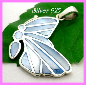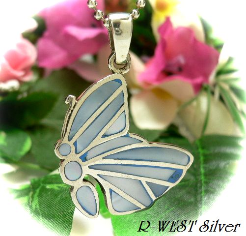 シルバー925銀のシェル貝殻入り蝶ちょうちょ型プレート ペンダント/ブルー