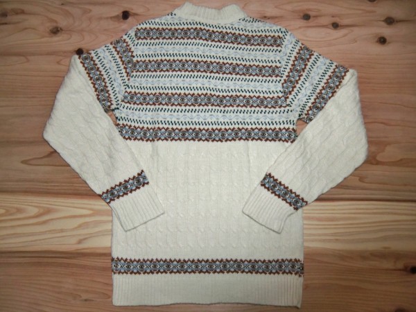 胸から上が総柄のボーダーになっていて、下半分はケーブル編みになっています。