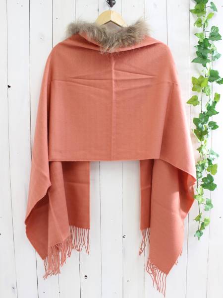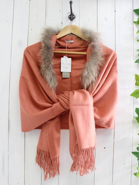 ラクーンファーが付いたストールの出品です。