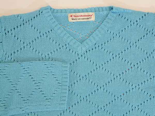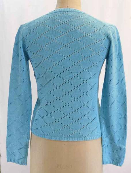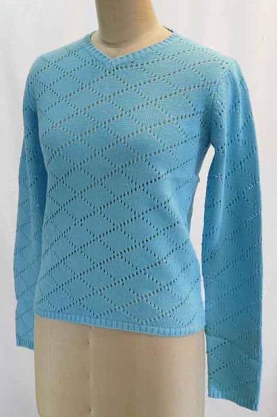 綿100% 透かしハチスレース編み 浅Vネック 長袖 ニット Sax