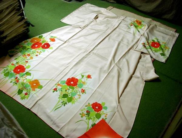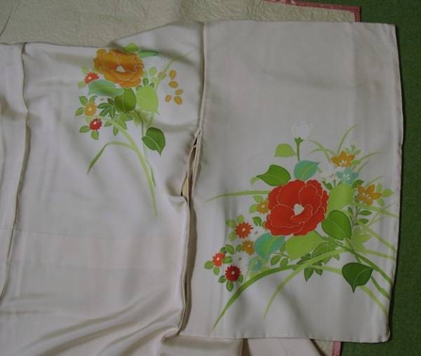 仕付糸が付いています。胡粉色の地に草花模様が描かれています。胴裏地が少し薄くヤケていますが着用に支障はございません。