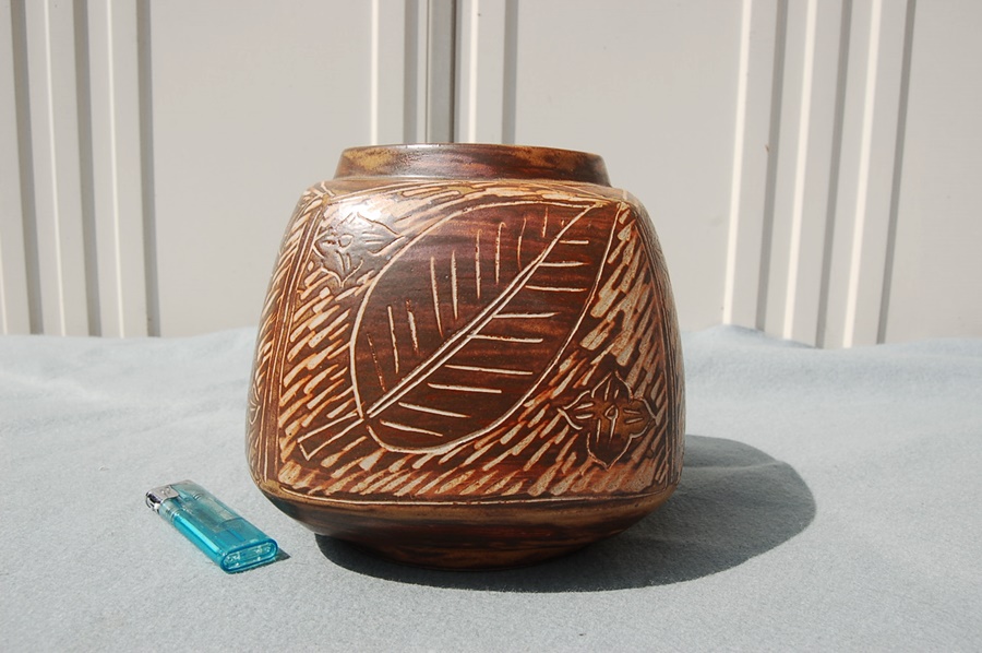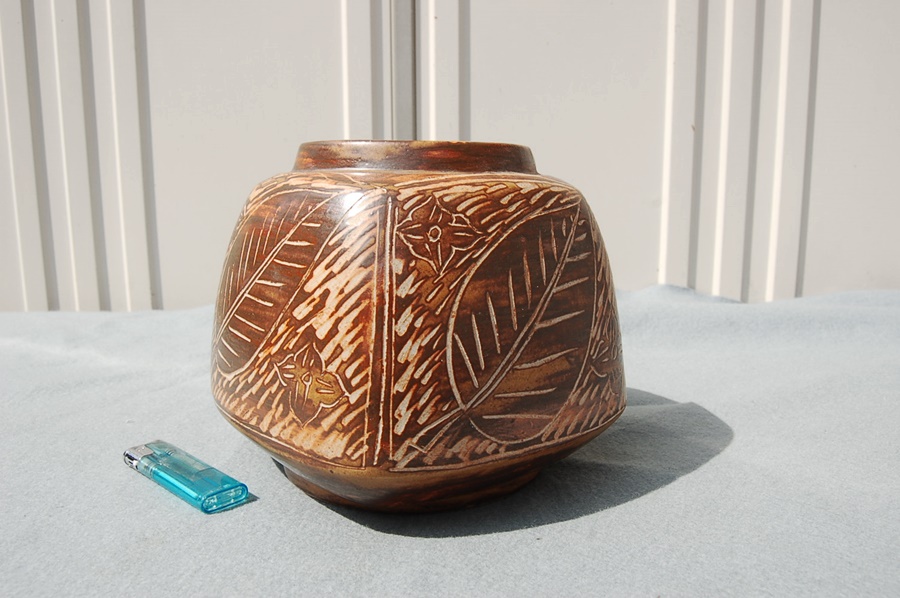 花瓶 角型 木の葉・草文刻 茶釉 けん山:造