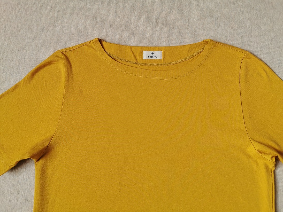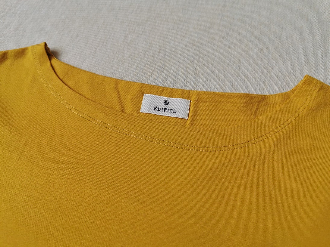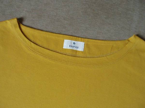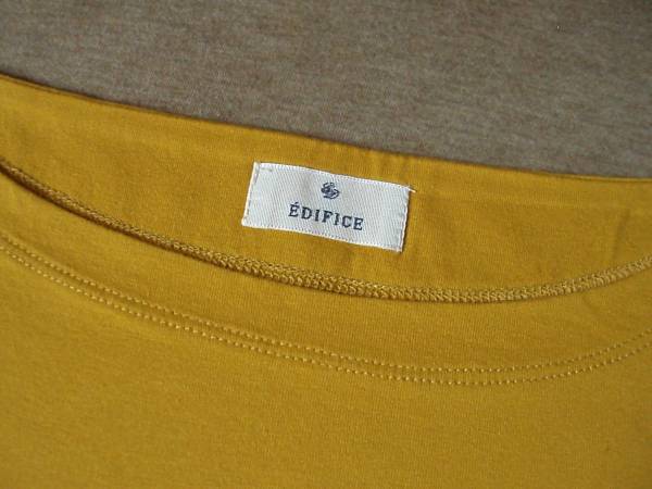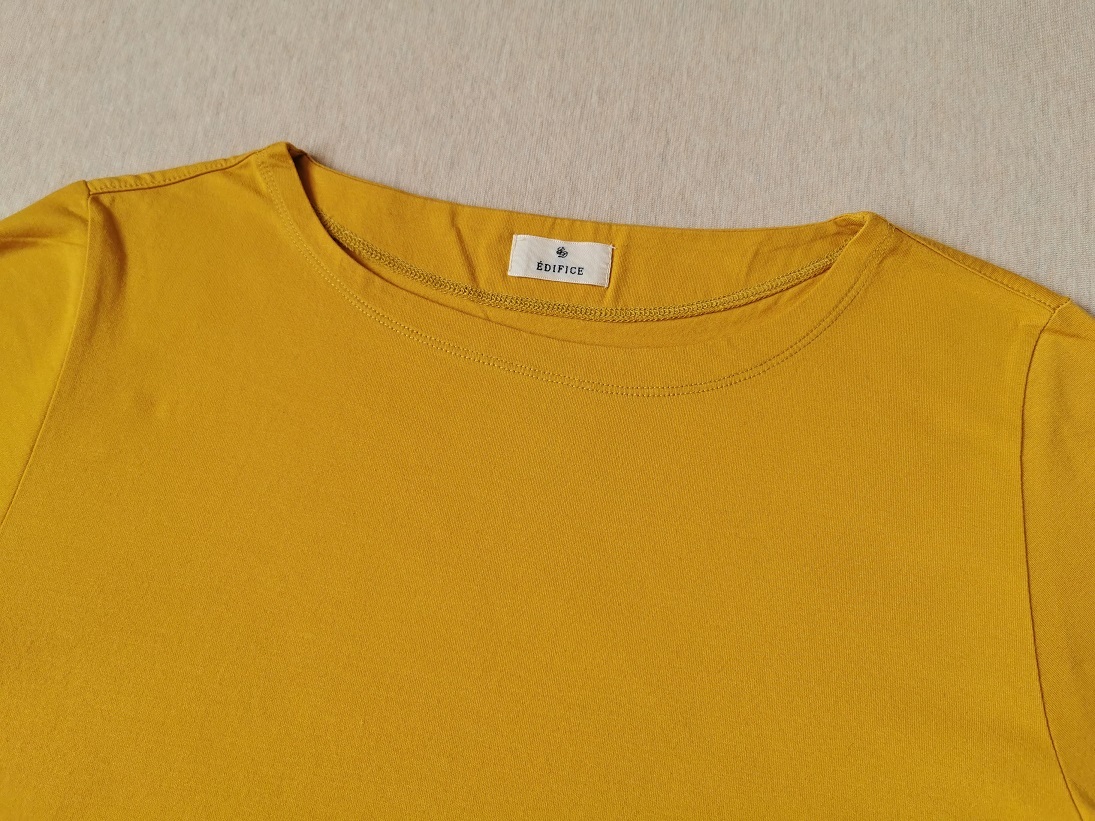 エディフィスのボートネックTシャツです。エディフィスのフラッグショップである大阪ルクア店にて購入しました。エディフィスらしいボートネックなのでエディフィスが得意とするマリンスタイルやカラーとコーディネートしやすい一枚ではないでしょうか(画像参照)。素材はコットン94%、ポリウレタン6%の混紡生地を使用しているのでボディは肌触りがよく、ポリウレタンのとろみ感と伸縮性からノンストレスな着心地です。スレッドも同じシャイニーマスタードで仕上げられているので統一感もあり、お手持ちのアウターやパンツとも合わせやすいかと思います。出品商品は数シーズン前のコレクションなので現在では入手困難です。実際yahoo!オークションをはじめ、他のオークションでも目にしたことがありません。エディフィスでこのデザインを探されている方にオススメしたい商品です。数回着用後に手洗い対応したため、スレ、傷等は見受けられませんが、自宅保管品であることをご理解の上、ご入札ください。【サイズ】44 身幅45.5㎝、着丈62.5㎝、肩幅38.5㎝、袖丈23.5㎝(生地に伸縮性もありますので概寸としてご参照ください)。よろしくお願いします。