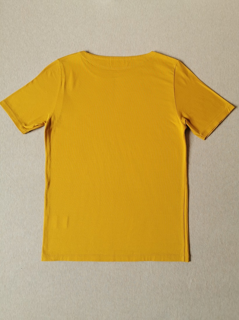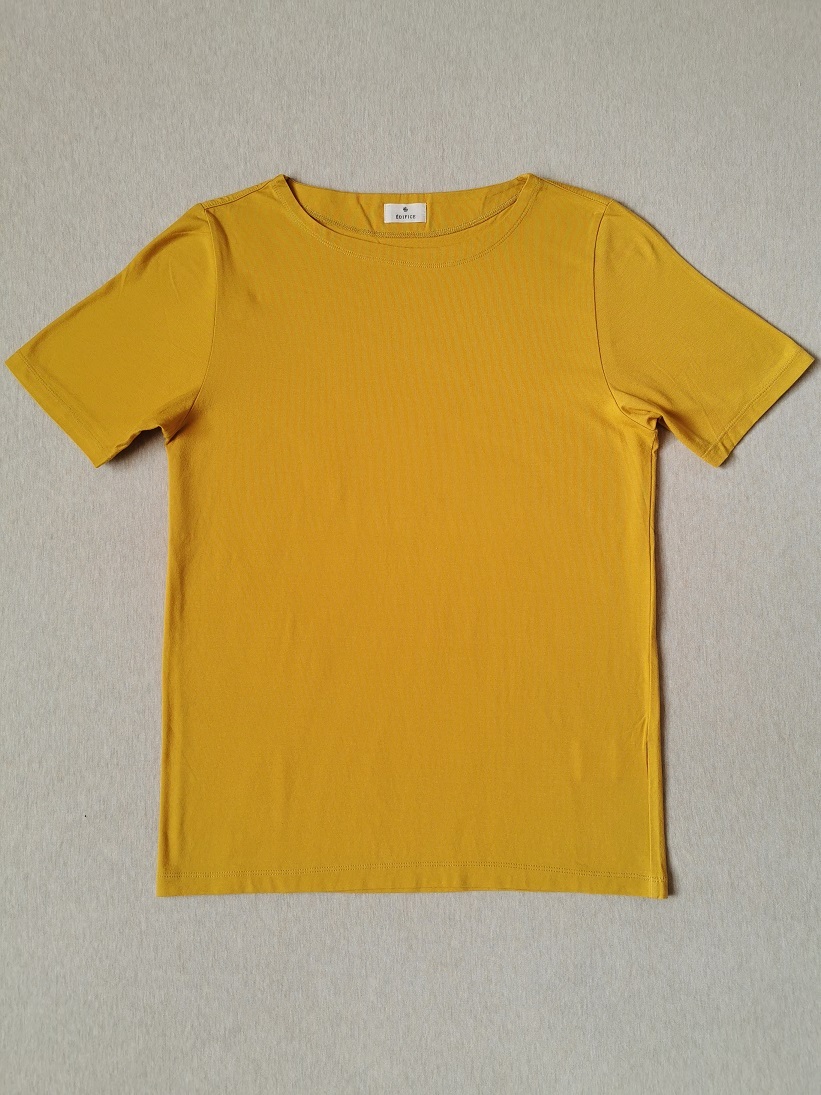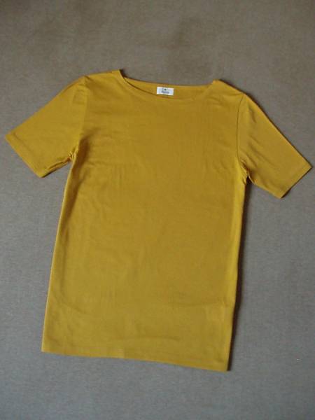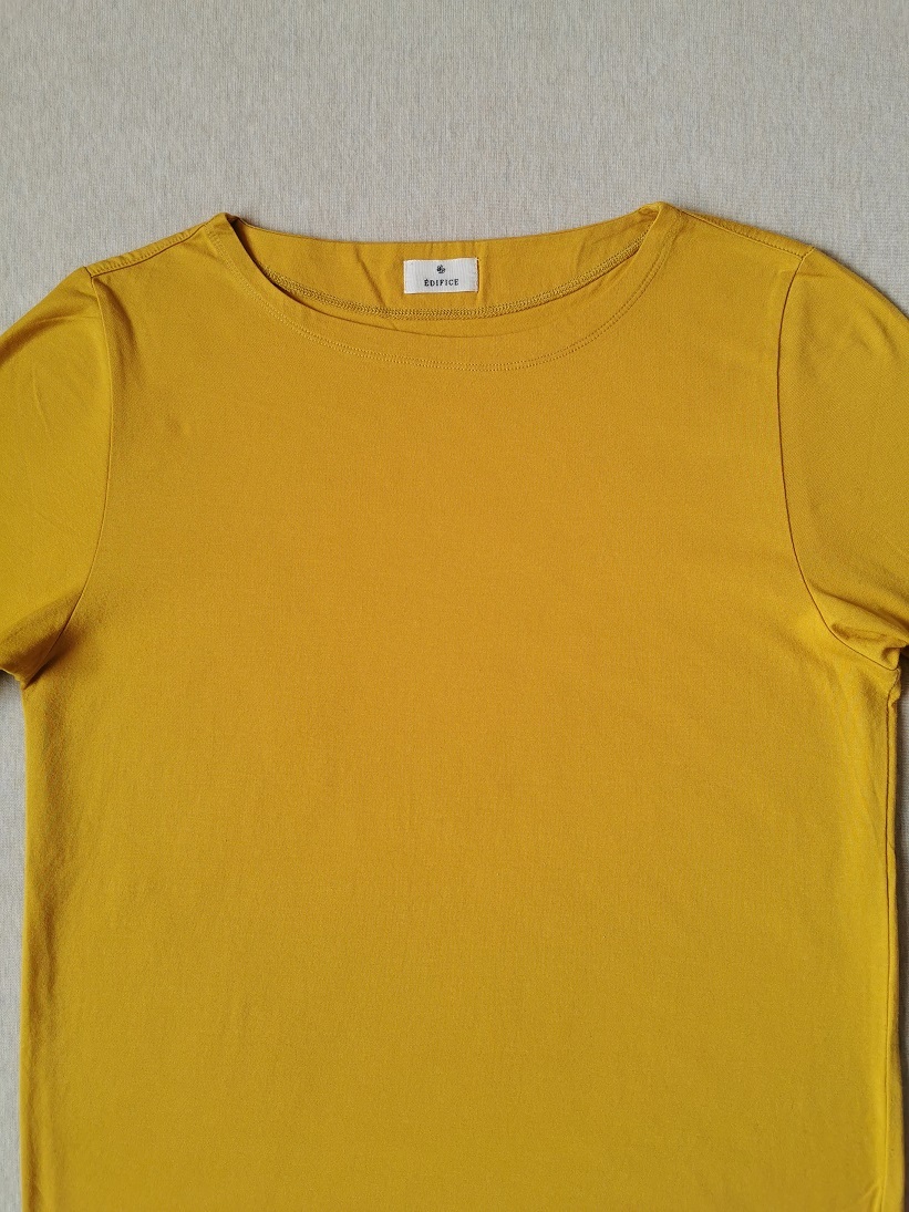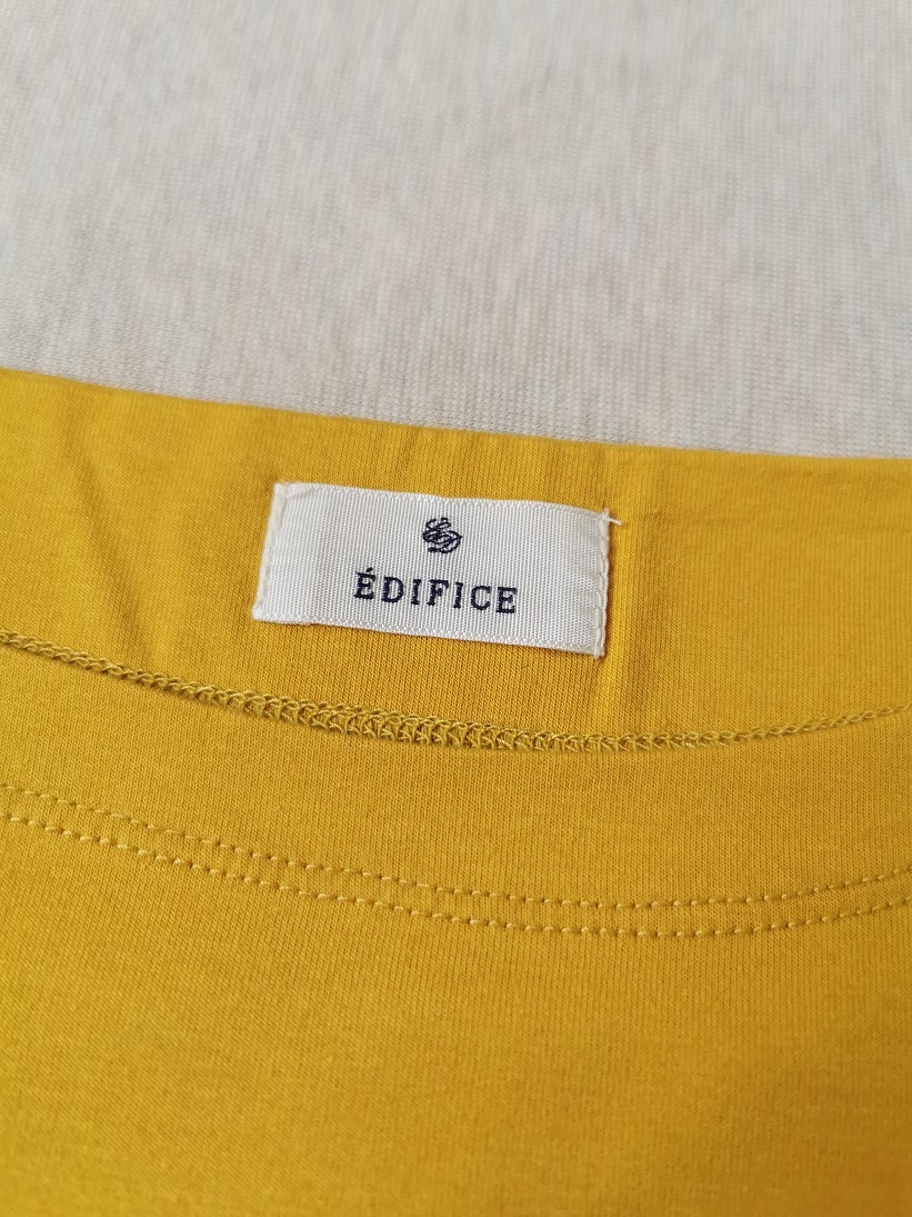 エディフィスのボートネックTシャツです。エディフィスのフラッグショップである大阪ルクア店にて購入しました。エディフィスらしいボートネックなのでエディフィスが得意とするマリンスタイルやカラーとコーディネートしやすい一枚ではないでしょうか(画像参照)。素材はコットン94%、ポリウレタン6%の混紡生地を使用しているのでボディは肌触りがよく、ポリウレタンのとろみ感と伸縮性からノンストレスな着心地です。スレッドも同じシャイニーマスタードで仕上げられているので統一感もあり、お手持ちのアウターやパンツとも合わせやすいかと思います。出品商品は数シーズン前のコレクションなので現在では入手困難です。実際yahoo!オークションをはじめ、他のオークションでも目にしたことがありません。エディフィスでこのデザインを探されている方にオススメしたい商品です。数回着用後に手洗い対応したため、スレ、傷等は見受けられませんが、自宅保管品であることをご理解の上、ご入札ください。【サイズ】44 身幅45.5㎝、着丈62.5㎝、肩幅38.5㎝、袖丈23.5㎝(生地に伸縮性もありますので概寸としてご参照ください)。よろしくお願いします。