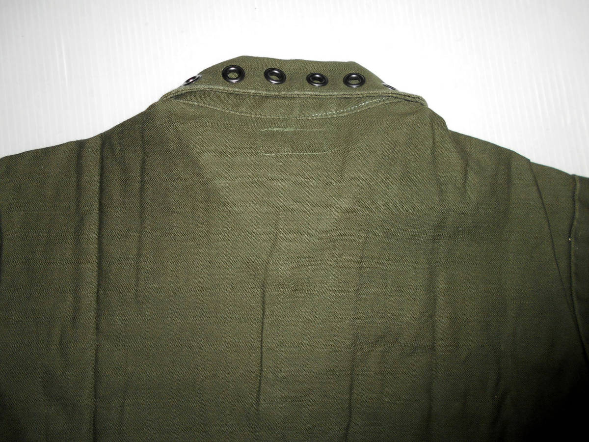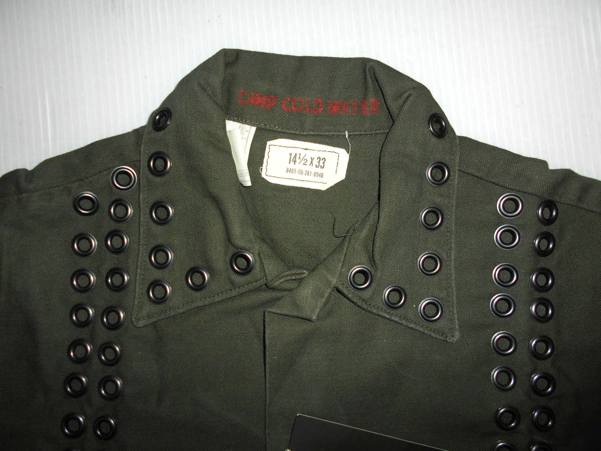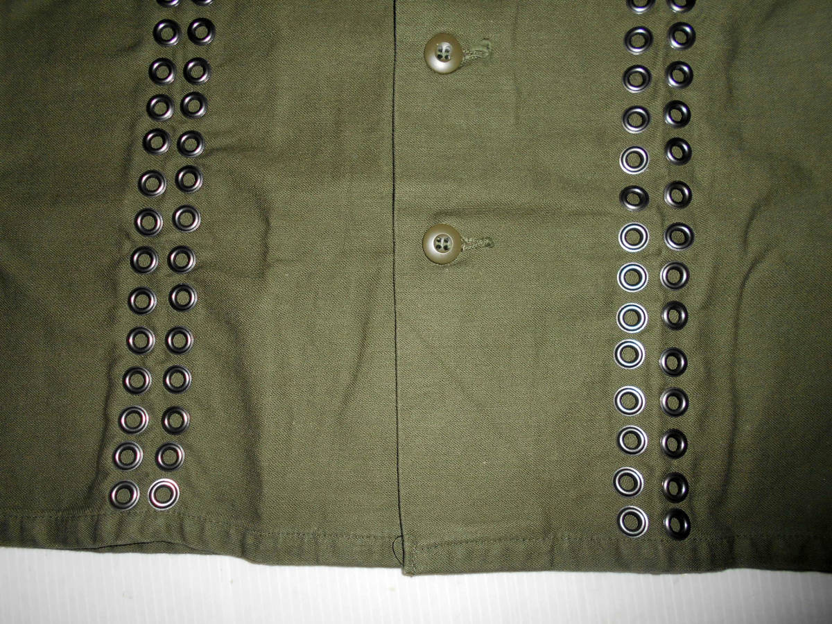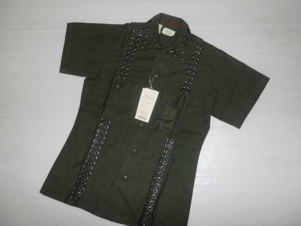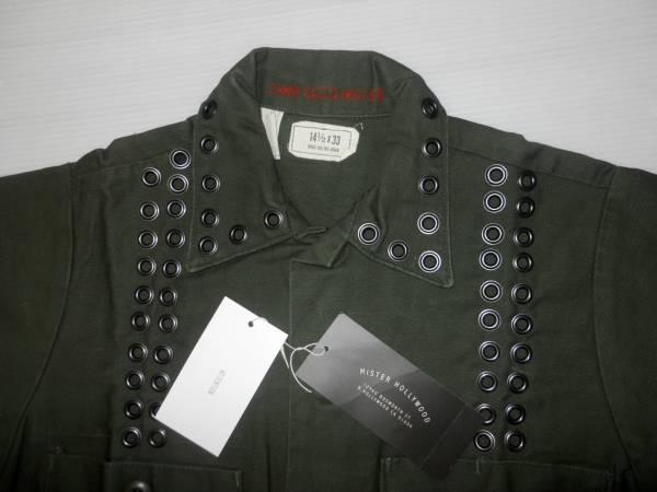 未使用■ミスターハリウッド リベットリメイクミリタリーシャツです。定価は18900円です。この製品はユーズドのミリタリーシャツにリベットを打ち込んでリメイクしたシャツです。未使用品ですがその点ご理解ください。色はアーミーグリーンです。