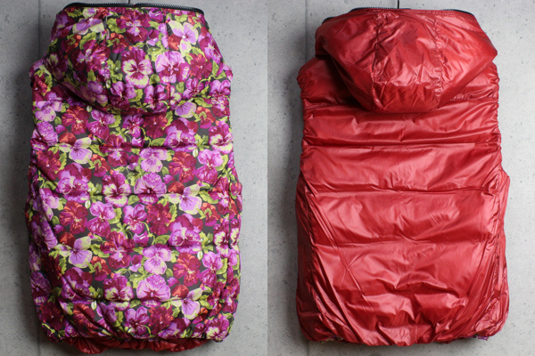 パーカ部分まであるジップが奇麗なラインを作っているリバティ生地と無地の使い勝手の良いリバーシブルのダウンベストです。