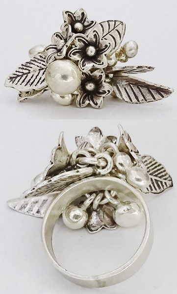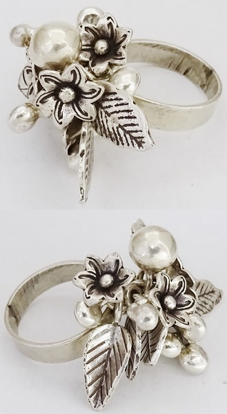 タイ北部に住む山岳民族カレン族のシルバーリングです。 カレン族シルバーの純度は非常に高く、1つ1つがハンドメイドで丁寧に作られており、個性的なデザインが特徴です。 花や葉などのシルバービーズを贅沢に使ったリングです。 ●サイズ:約18号 |