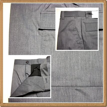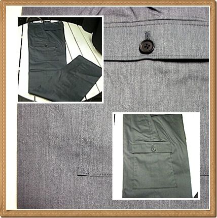 ミディアムグレーの無地 薄地 綿混の微光沢生地です。穿き心地良い 伸縮するストレッチ素材。 存在感あふれる イージーカーゴパンツ です。サイドポケット と フラップ付きバックポケットのこだわりディティールです。素材は ポリエステル 60 %  綿 35 %  ポリウレタン 5 %です。 サイズは ウエスト 82cm 渡り幅 30cm 腿幅(股下10cmの所) 27,3cm 裾幅 19cm 前股上 26,5cm 股下(1,5cmステッチ仕上げ) 85,5cm の 表示 L サイズ です。 以上 こだわりの Yポケットデザインでテーパードシルエットです。勿論 新品ですので、お好きな長さで 裾上げ修理し 着用可能です。尚 毎週木曜日は業務定休日です。ご連絡、ご発送とも木曜明けの金曜日にずれ込む事 ご了承下さい。よろしくお願い申し上げます。尚、商品は店頭にても、同時販売致しております故、売り切れのケースもあります。その場合 お取引頂けない場合も有ります。予め ご了承 ご容赦頂きます様 お願い申し上げます。