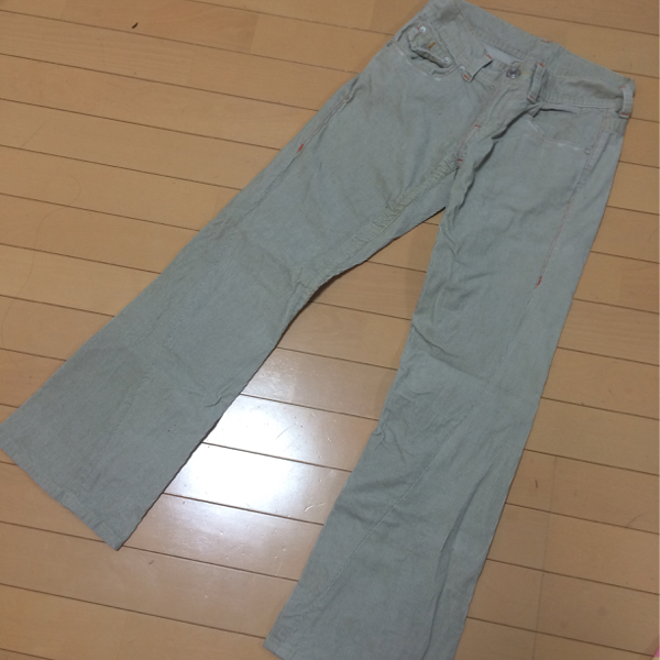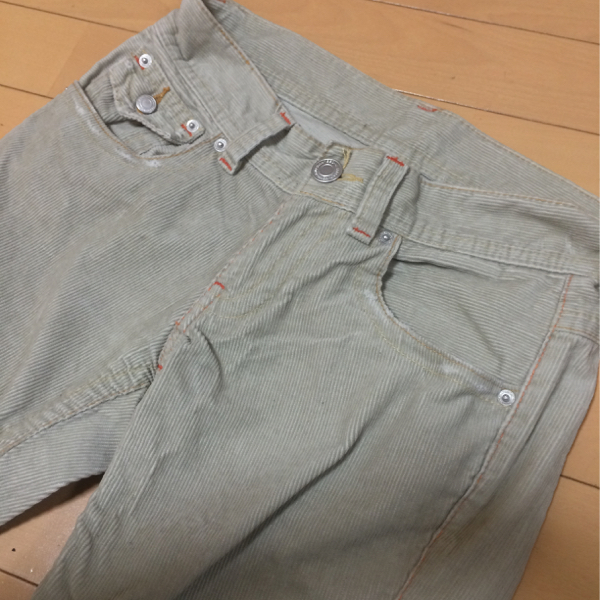 ◆オレンジのステッチ糸が可愛いコーデュロイパンツ♪ポケット部にハード過ぎない程度のダメージ加工あり♪ブーツカットライン