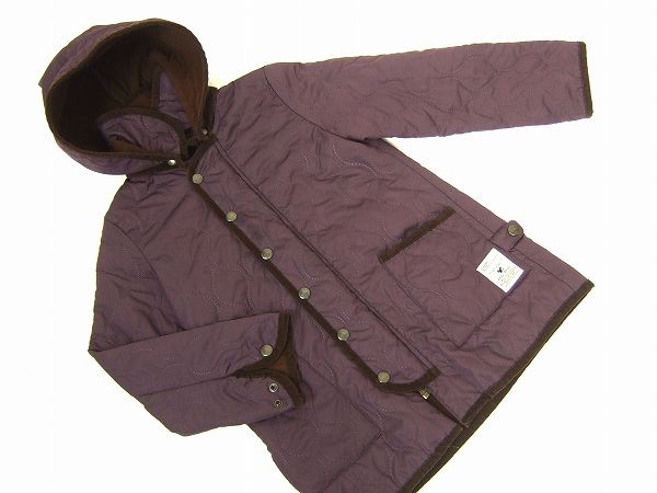 ふっくらとした艶感のある素材、落ち着きのある紫カラーに幾何学柄が素敵な暖かフード付きジャケットです。フロントロゴ釦あり、フード取り外し可能。