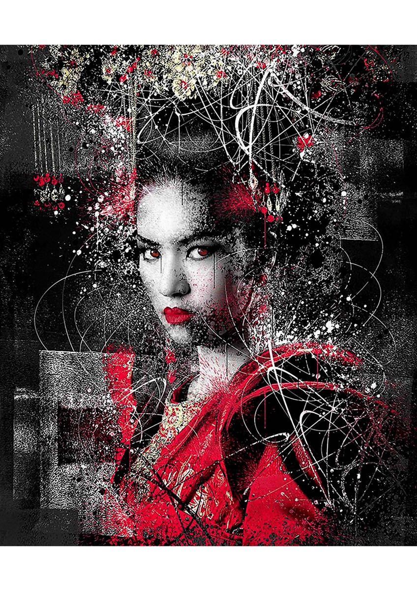 美しい着物姿の日本美人と、モダンアートのコントラストがクールなグラフィティデザインです。