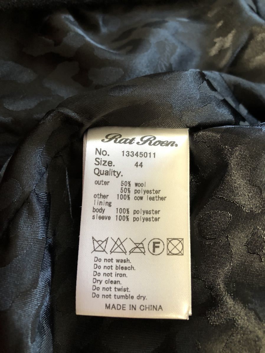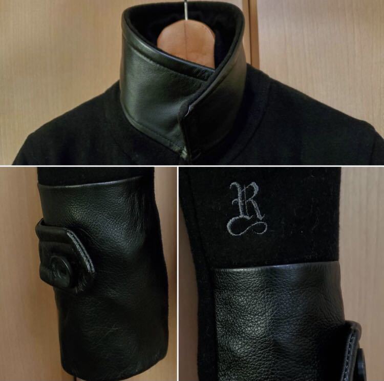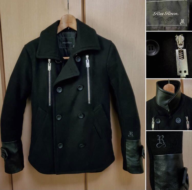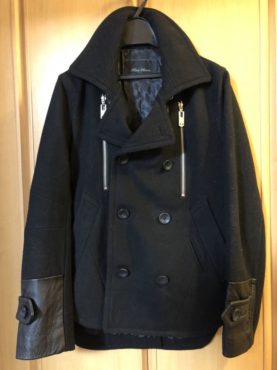 その他:ラットロエンのレザー切替メルトンピーコートです。襟の裏や袖口に牛革が使用されています。前身頃がややショート丈、後見頃のほうがやや長いデザインです。胸にジップがあしらわれておりロック感があります。またジップ部はスカルデザインとなっています。定価は約5万円でした。画像10のタグは付属しません。着用シルエットが綺麗です。