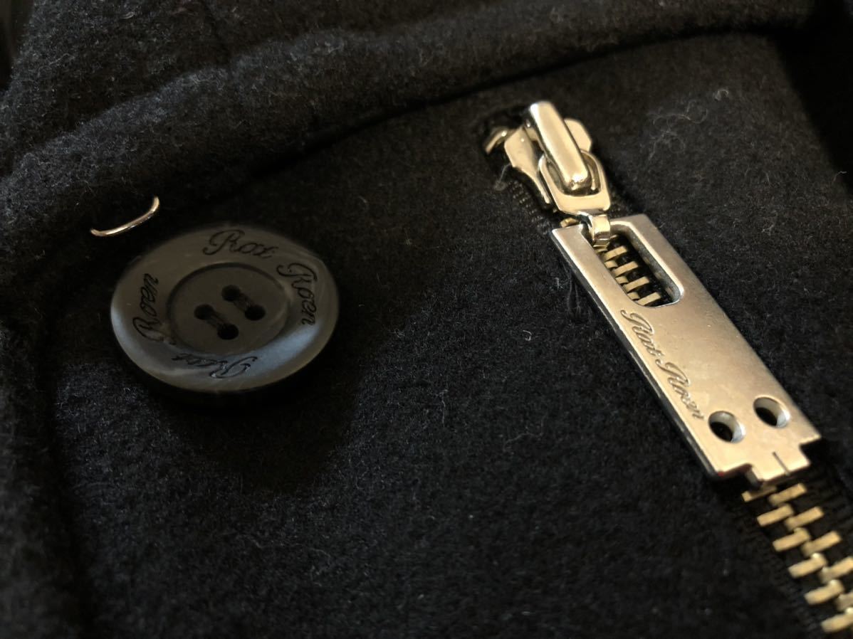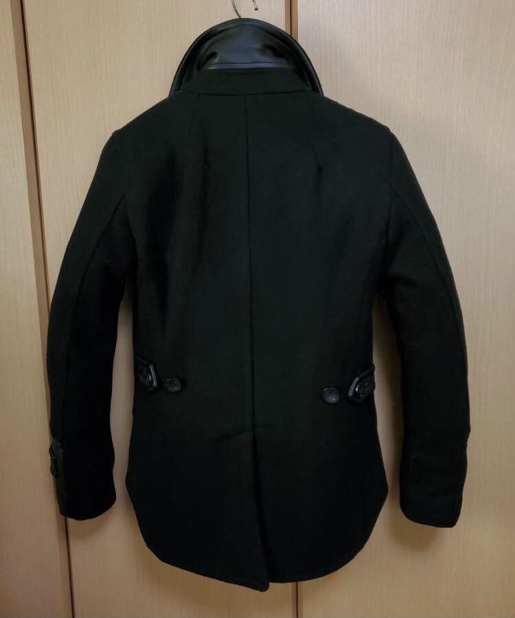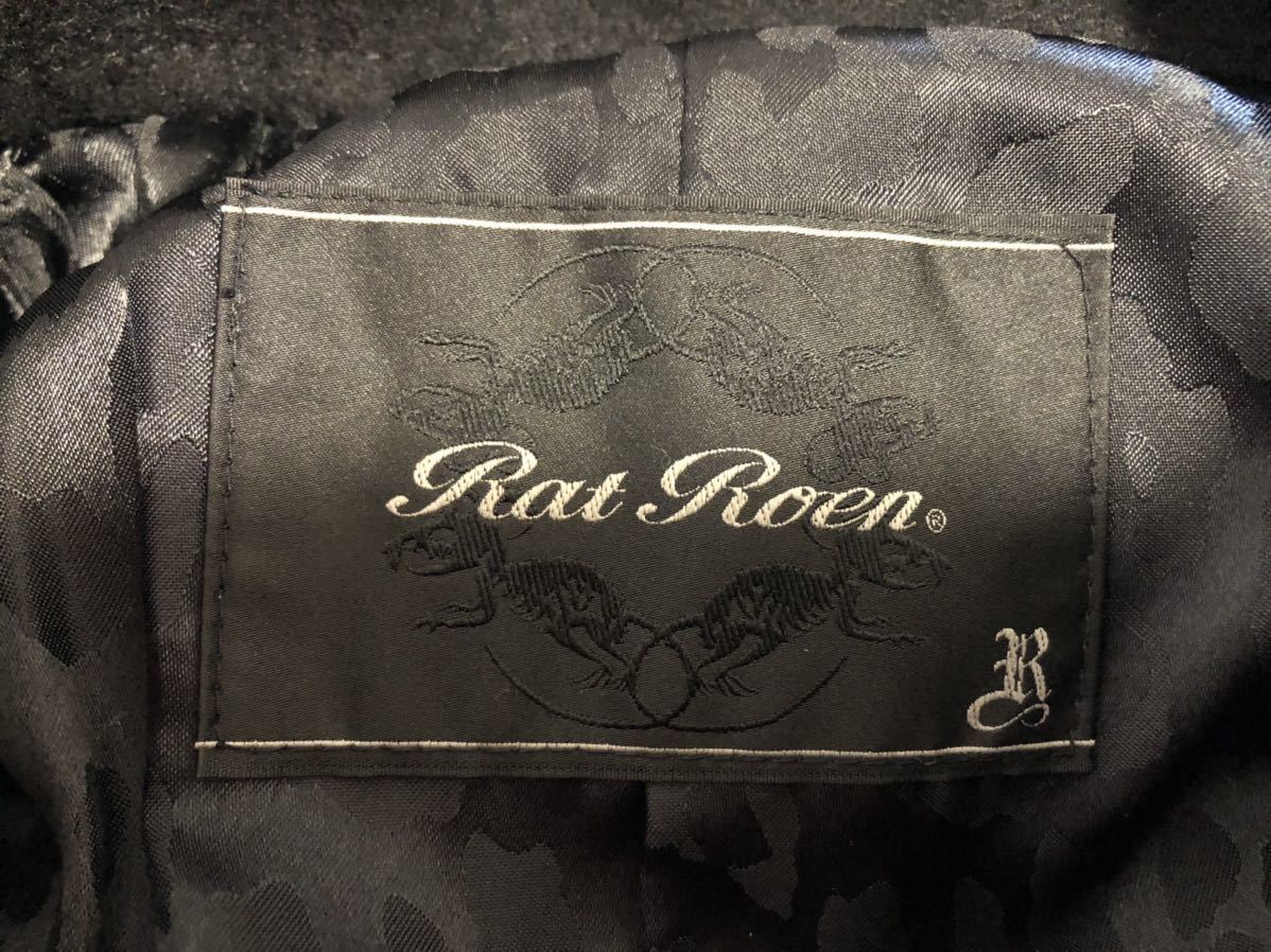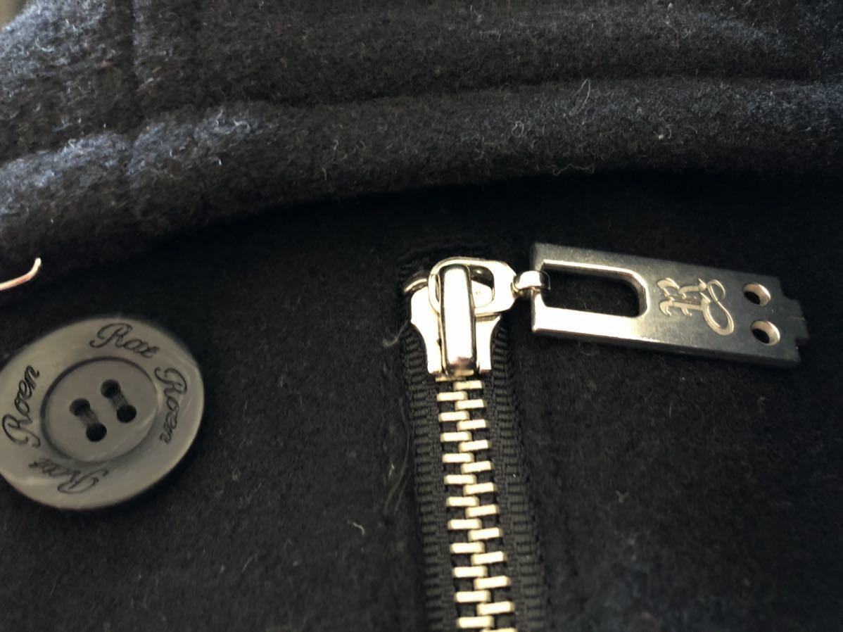 その他:ラットロエンのレザー切替メルトンピーコートです。襟の裏や袖口に牛革が使用されています。前身頃がややショート丈、後見頃のほうがやや長いデザインです。胸にジップがあしらわれておりロック感があります。またジップ部はスカルデザインとなっています。定価は約5万円でした。画像10のタグは付属しません。着用シルエットが綺麗です。