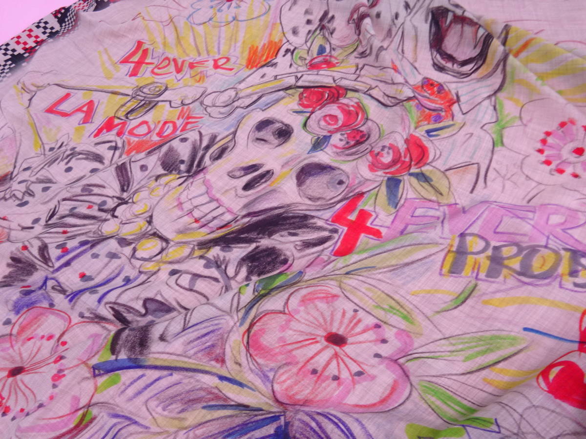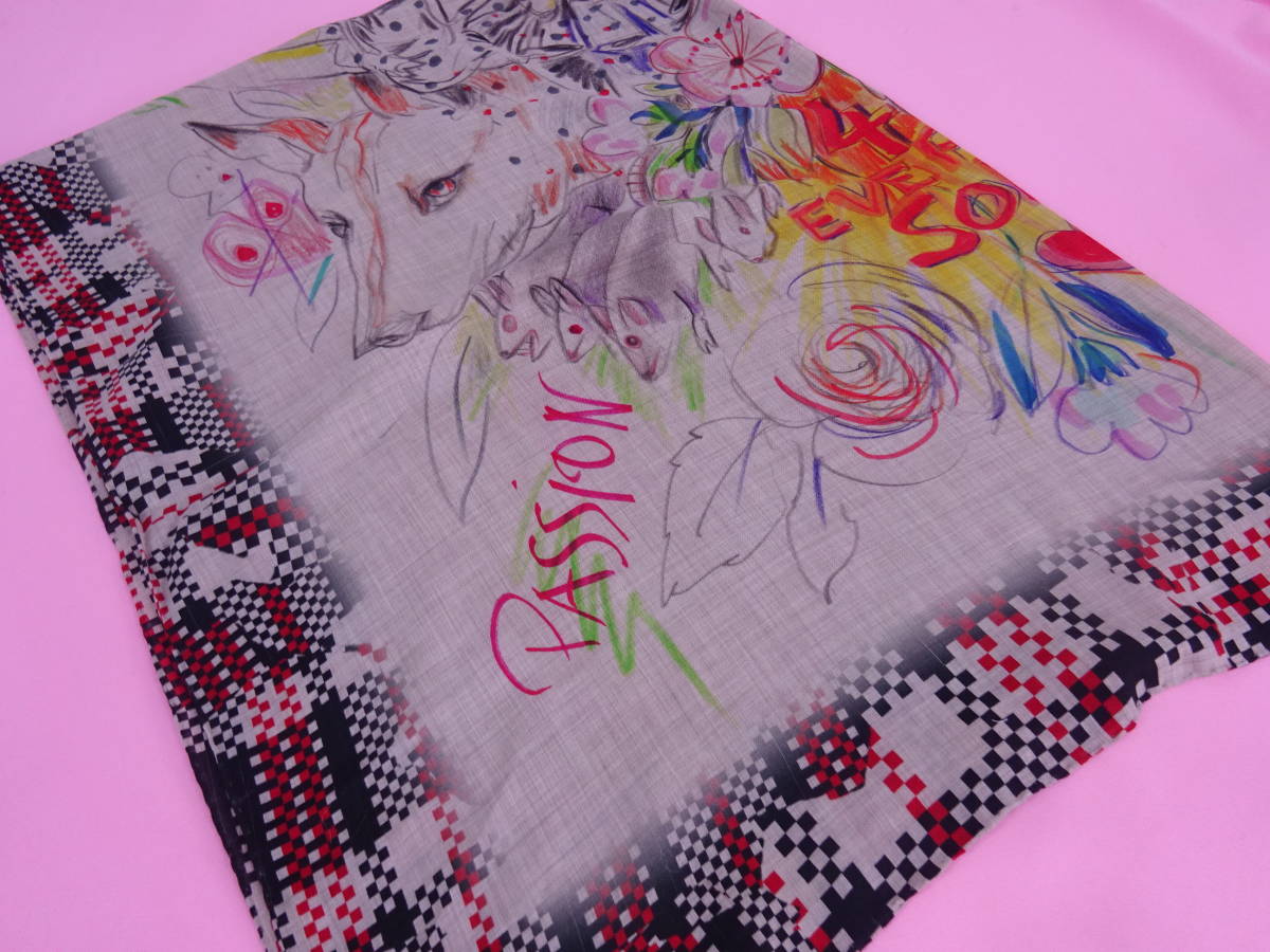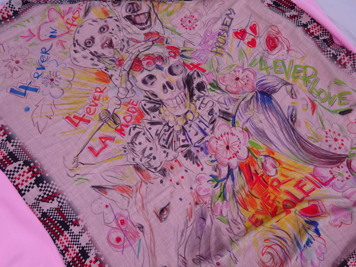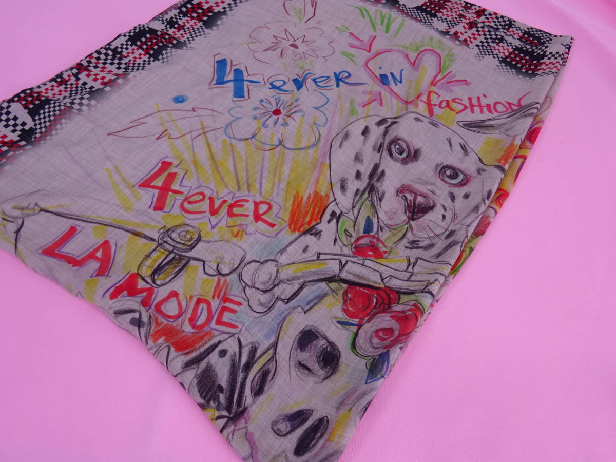 グラデーションになったブロックチェック柄に、わんちゃん、スカルなどのイラストをラフに描いたプリントがモダンで、洗練されたイメージです。