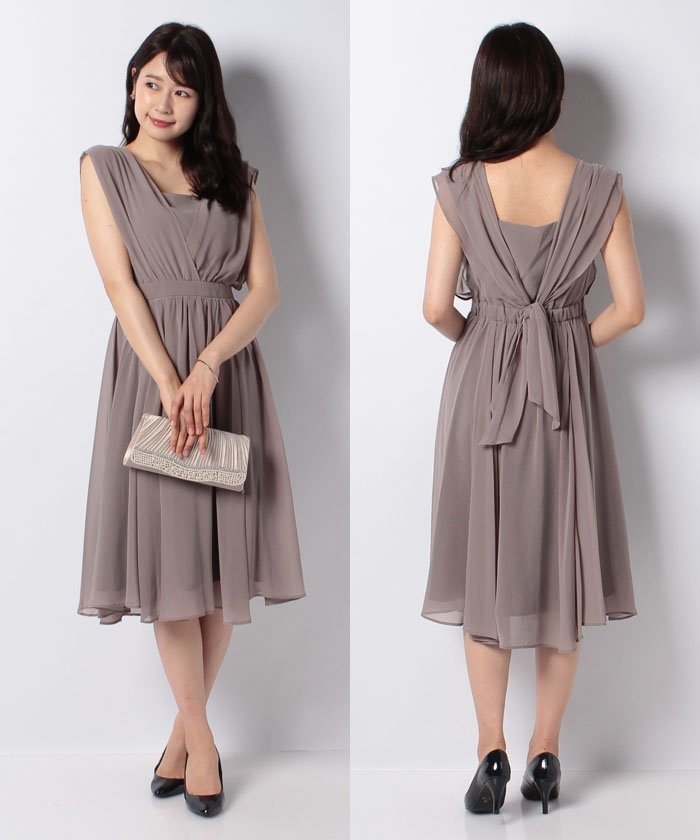 シアーな透け感が女性らしいシフォン素材のフォーマルワンピース。肩を覆う清楚でプレーンなデザインは、一枚で華やぎがあります。ホルターネックにすれば露出がグッと出てパーティーシーンで注目の的に。印象が異なる二通りの着方を楽しめるから、一着でマルチに活躍できます。