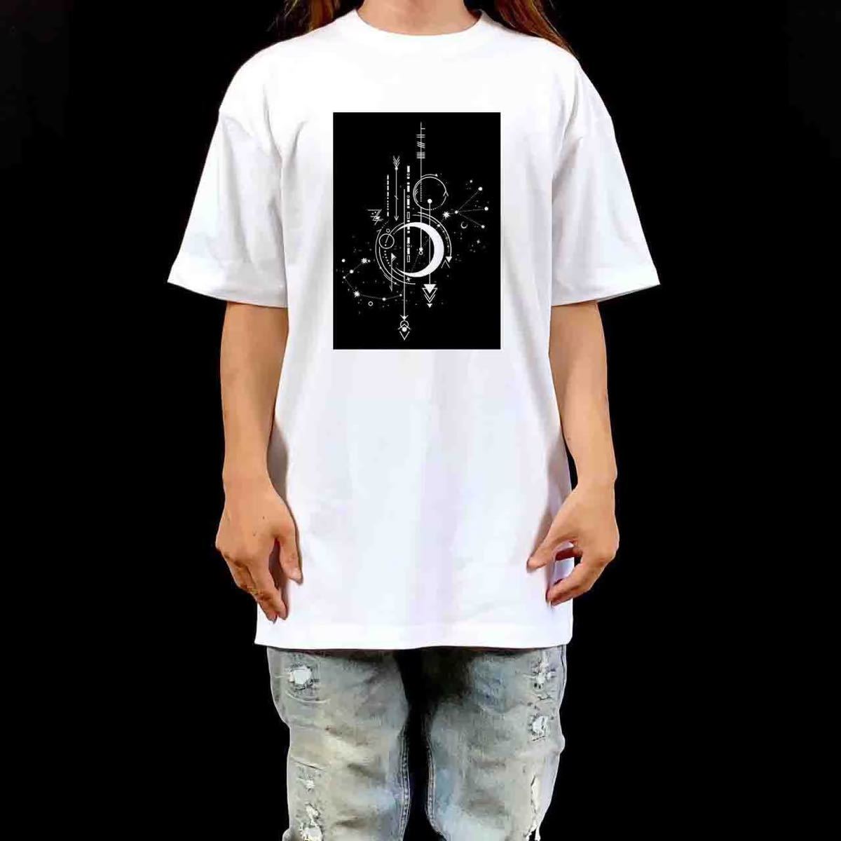 ネイティブアメリカンを連想させる弓矢や、月、星なとどが散りばめられた天体グラフィックデザイン。