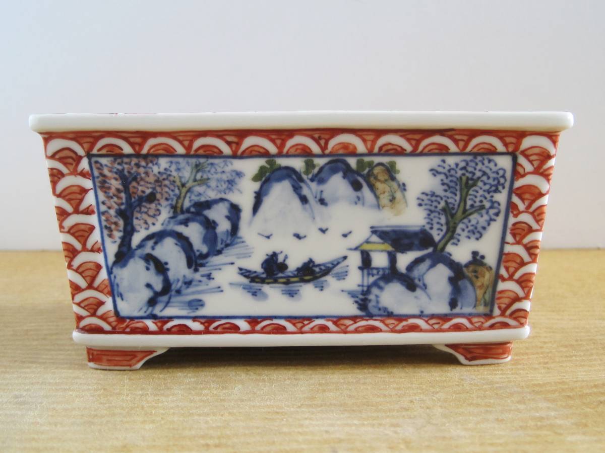 盆栽関連・鉢 ★ 平安香艸鉢 四角 五彩山水青絵赤枠 ★美しい色彩の繊細な絵柄