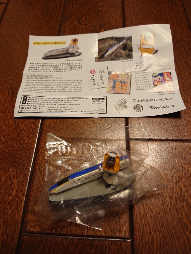 ぐんま鉄道コレクションの「E7系とぐんまちゃん」です。内袋未開封、リスト付きです。500円ガチャだけあってなかなか見事な造形に仕上がっています。送料ですが普通定形外郵便(補償無し)でよろしければ260円となります。