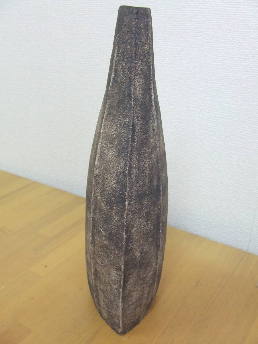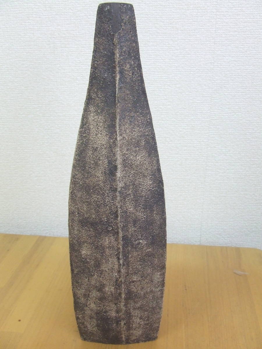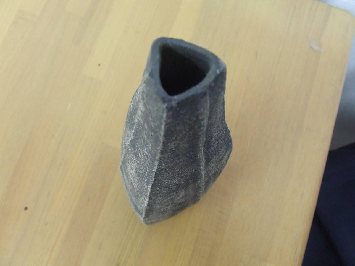 大変不思議な形状の花瓶です。口が小さいので一輪挿しと思いますが、背丈がありますので枝の長いバラなどにはお似合いの品と思います。形状の特徴が三角形で、上から下まで比例した形状で大きさが変化します。画像3が上、画像4が底です。写真でお分かりのように外側に丸く膨らんだ面になり、角にあたる部分は縦のラインが入ります。