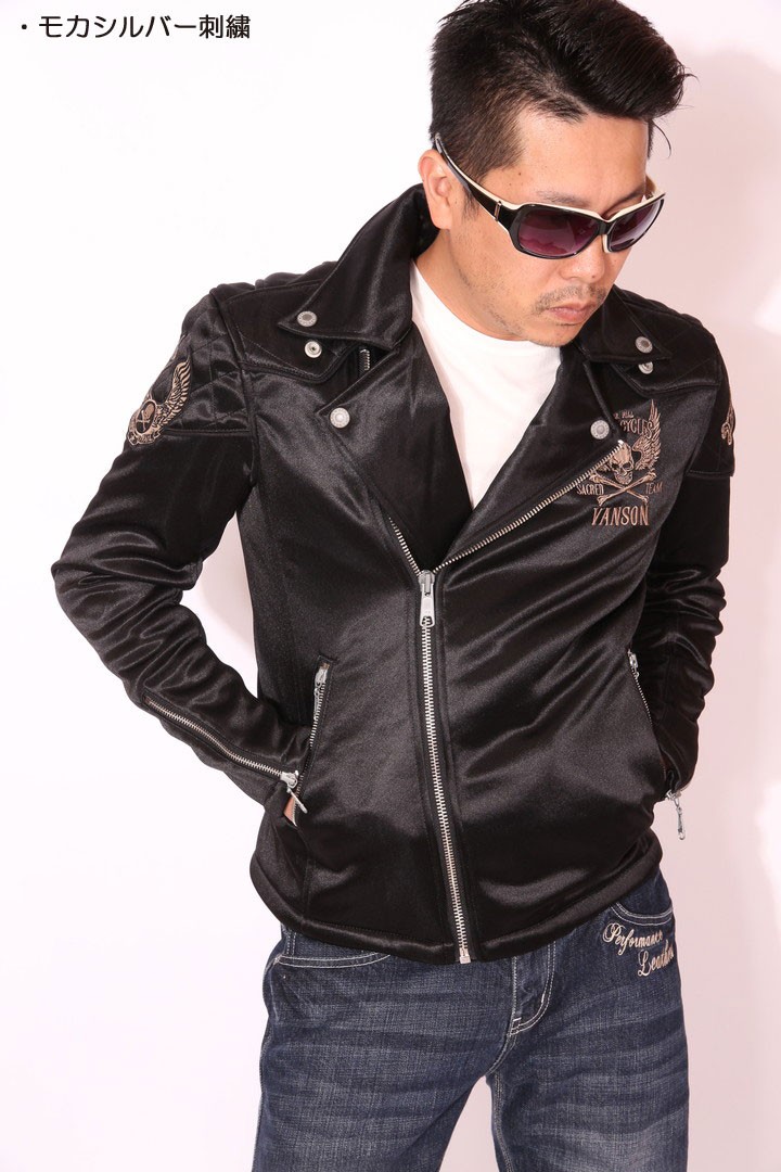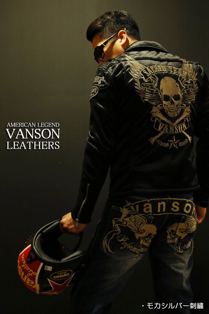 当店別注 バンソン VANSON ボンディング ダブルライダース ジャケット ACV-701 ブラック×モカシルバー刺繍【XLサイズ】刺繍 ドクロ