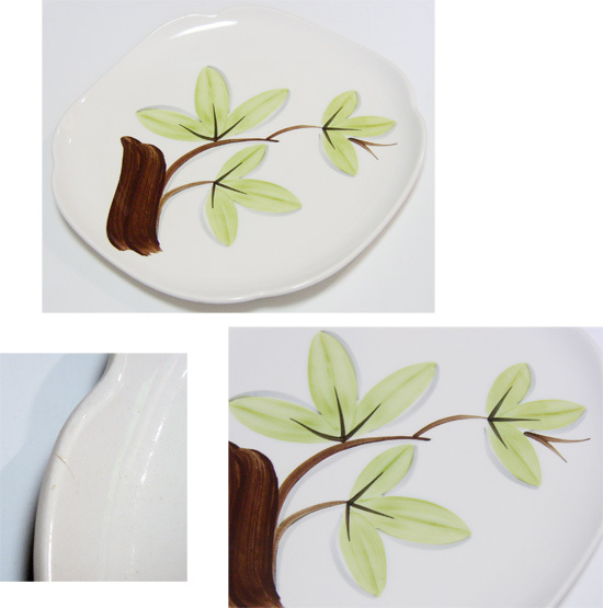 ヴィンテージ CONTINENTAL KILNS ハンドペイント Woodleaf 大皿 1枚です。状態は、古い物ですので、薄い擦り傷と製造過程による傷が左縁にありますが(画像3)、ビンテージの雰囲気ある物です。ハワイで購入しました。デザインや色合いがとても可愛いです。古い物ですので、状態はそれなりですが、年代物の風格とレトロ感ある物です。縦横 25.5cmです。ビンテージ物とご理解頂いて、ノークレーム、ノーリターンでお願い致します。②