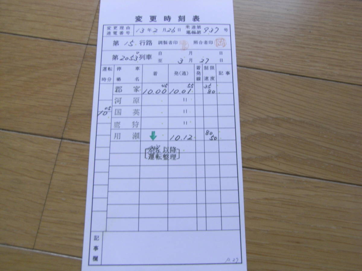 因美線 変更時刻表 2053D列車 郡家-用瀬 ●スタフ・運転士時刻表