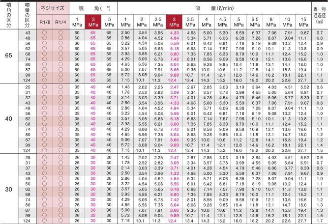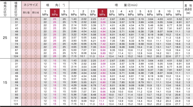※ノズルチップには様々なサイズがあります。基本は現在お使いのサイズと同じサイズでご使用ください。また、噴射量や噴射角度を変更したい場合は機械メーカー様にご相談の上、ポンプ、モーター等に負担のかからないサイズをご使用ください。