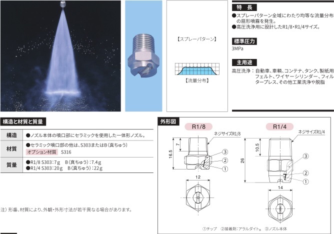 特長 ・スプレーパターン全域にわたり均等な流量分布の扇形噴霧を発生。