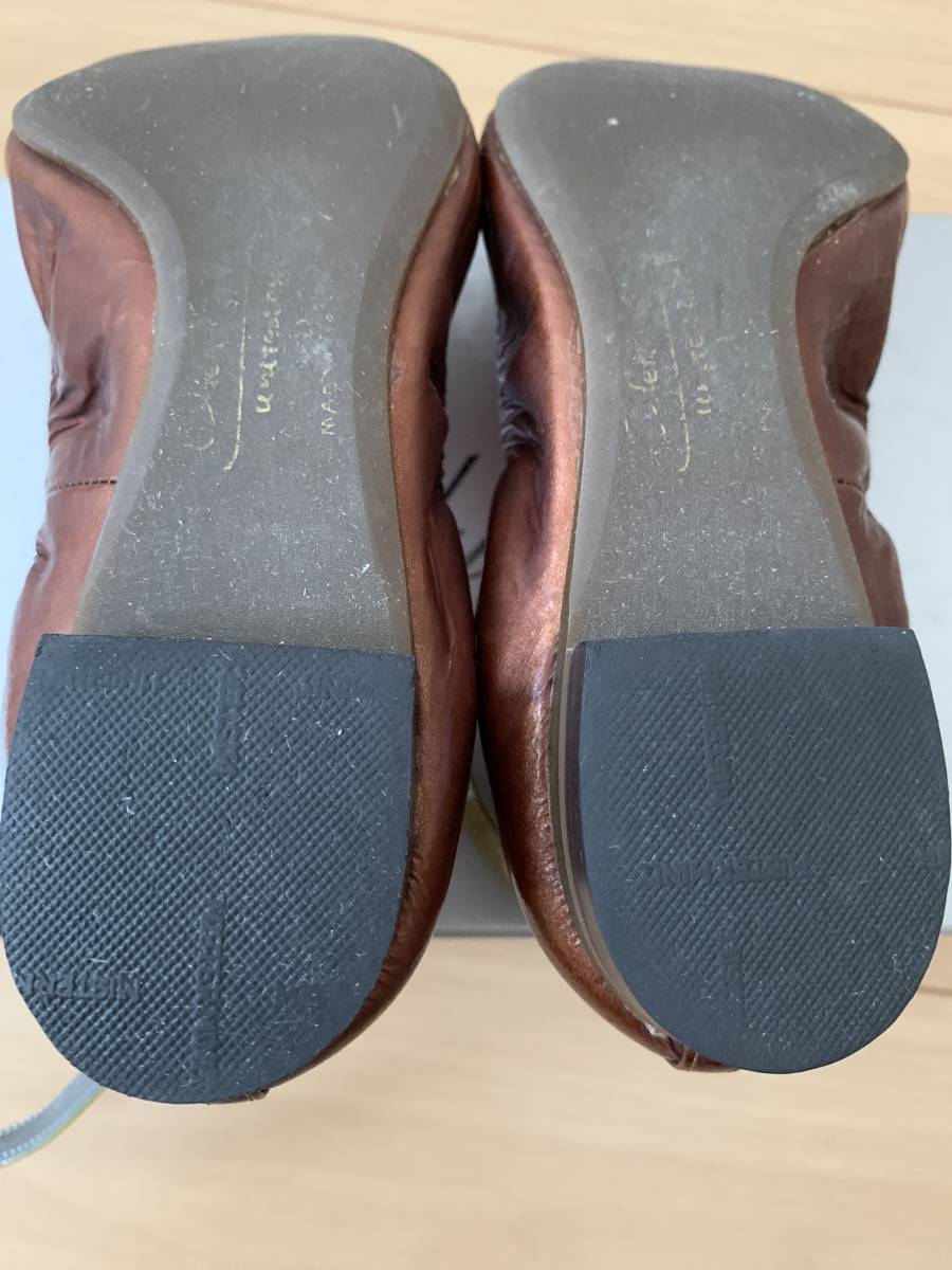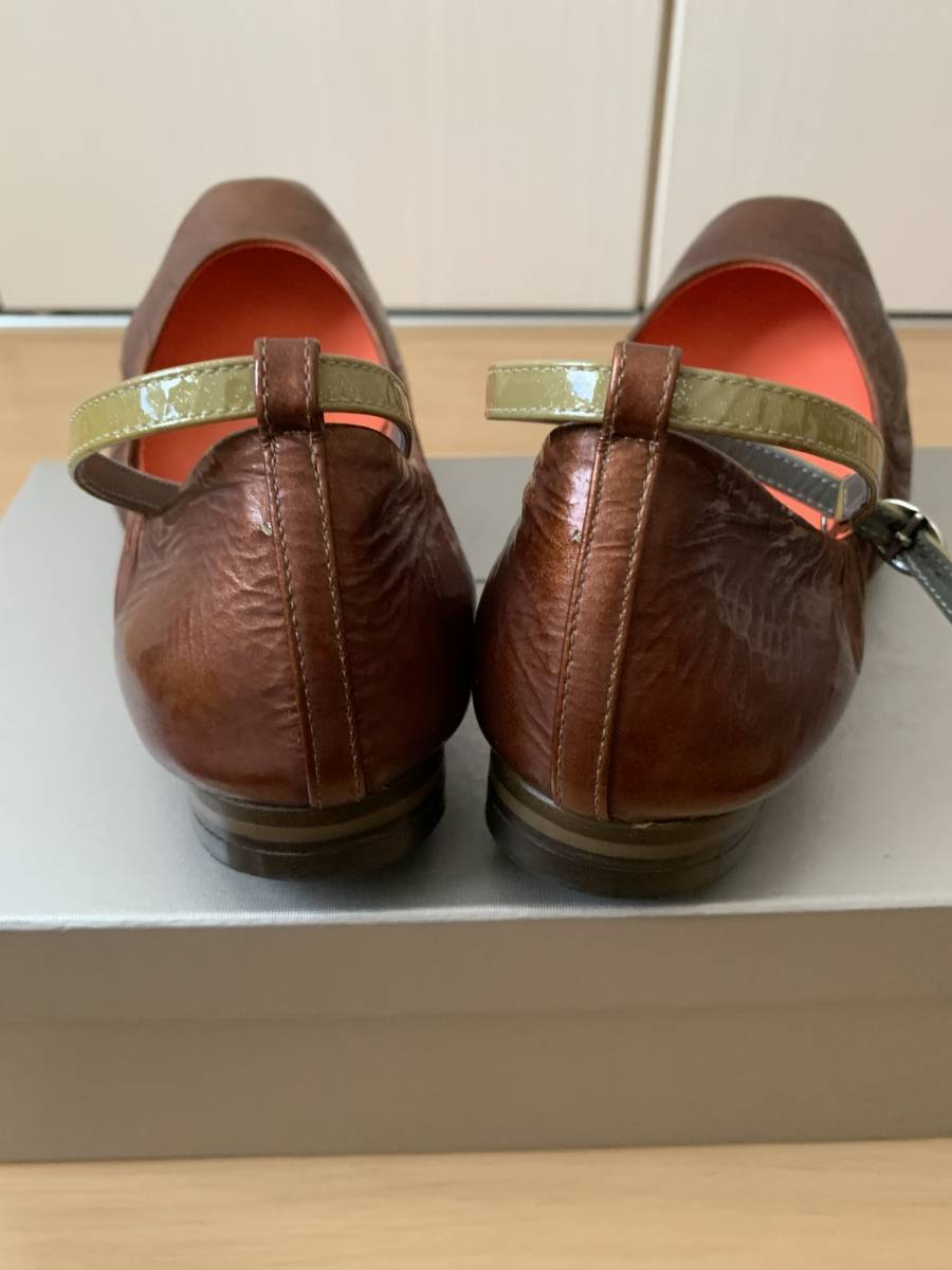 1回使用 Odette e Odile オデット エ オディールのフラットシューズです。サイズは22.5cmです。カラーはブラウン(赤みのある)ベルトはベージュです。牛革、エナメル素材です。ヒールね高さは1.5cmです。購入価格は27000円程でした。使用の為、ノークレーム、ノーリターンでお願いいたします。