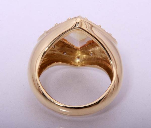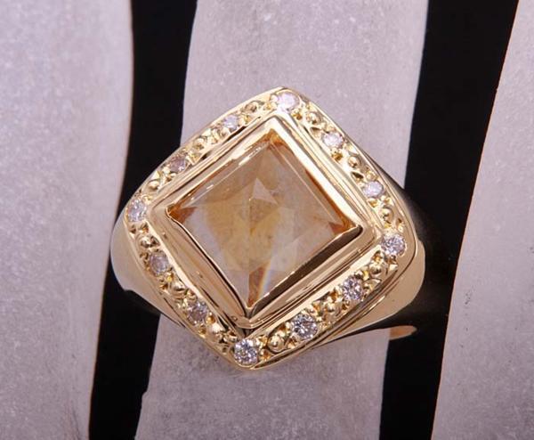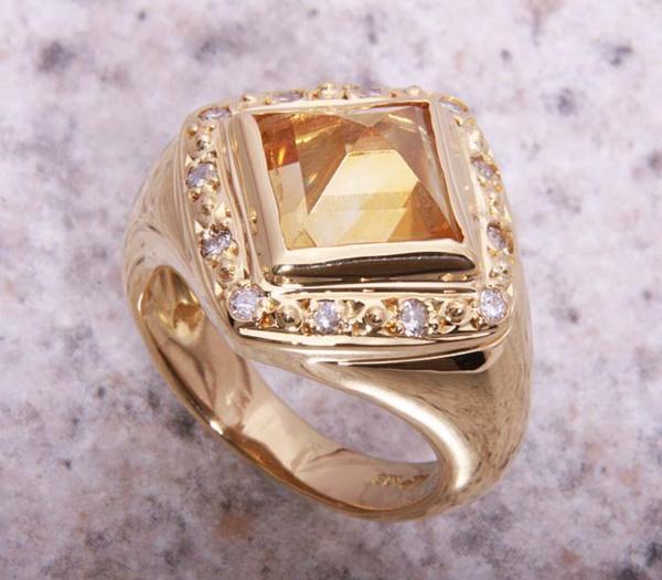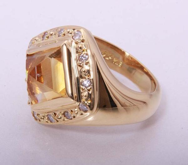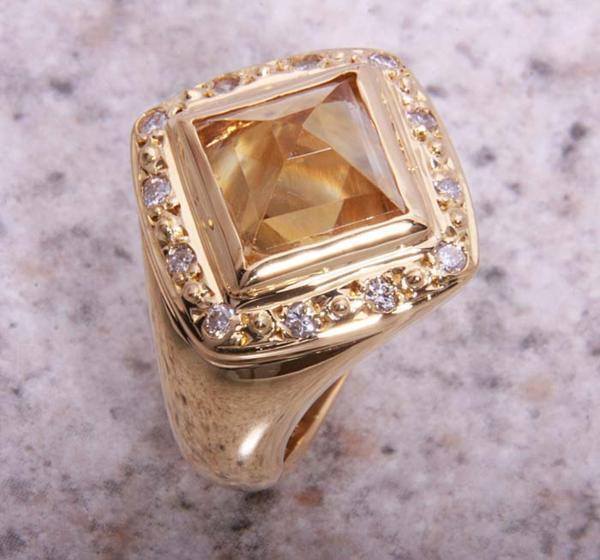 ピラミッドのようなカットの施されたシトリンが印象的なリングです。