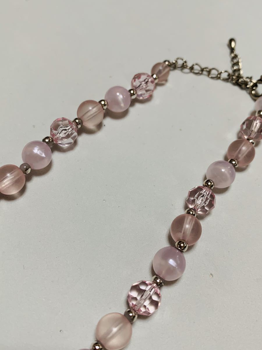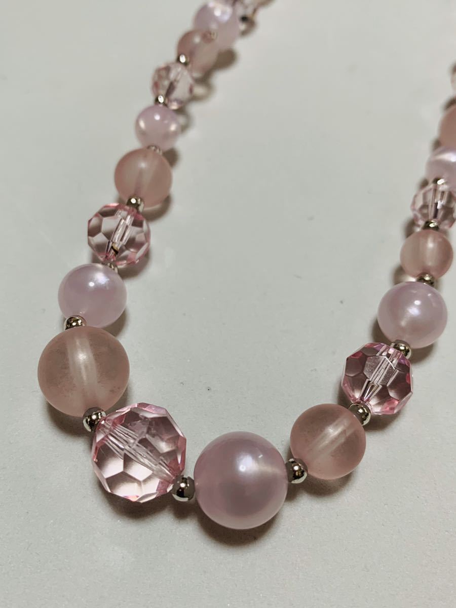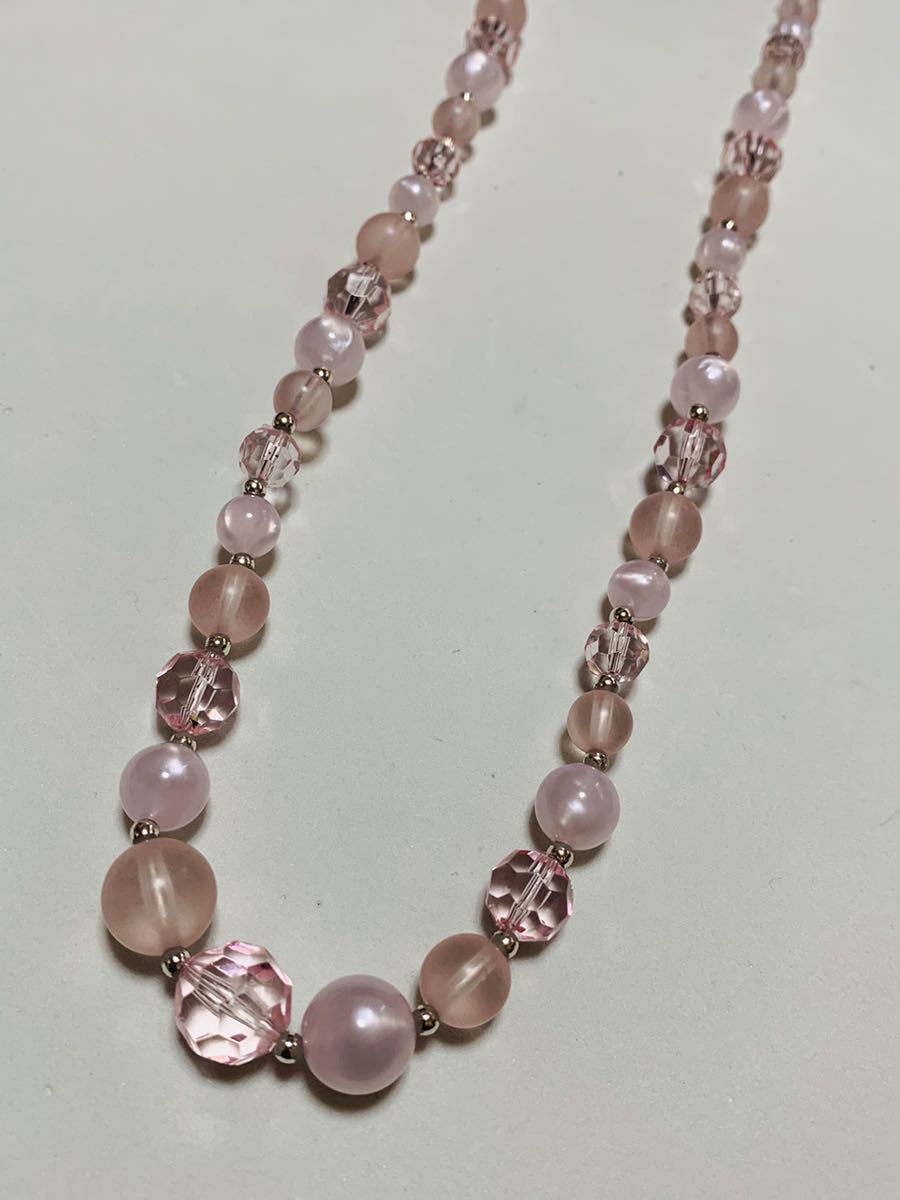 シェルと樹脂製ピンクピンク、ロングカラーネックレスです、淡いピンクの色合いの美しいネックレスです、ひと玉のサイズは大きい玉は12ミリ、小さな玉は6ミリ、ネックレスの長さは75センチで、二重に使えるネックレスです